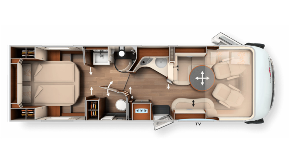 La cucina angolare comfort è dotata di un piano di lavoro arcuato che offre ampio spazio per preparare i pasti. Un cassetto verticale nella parete circolare del bagno fornisce ulteriore spazio di stoccaggio, mentre il bagno XL offre una zona lavandino aperta, una grande doccia a sezione circolare e una zona toilette integrata, il tutto arricchito da una finestra laterale per una luminosità naturale.