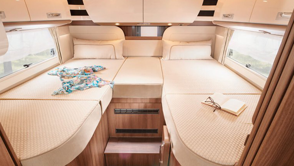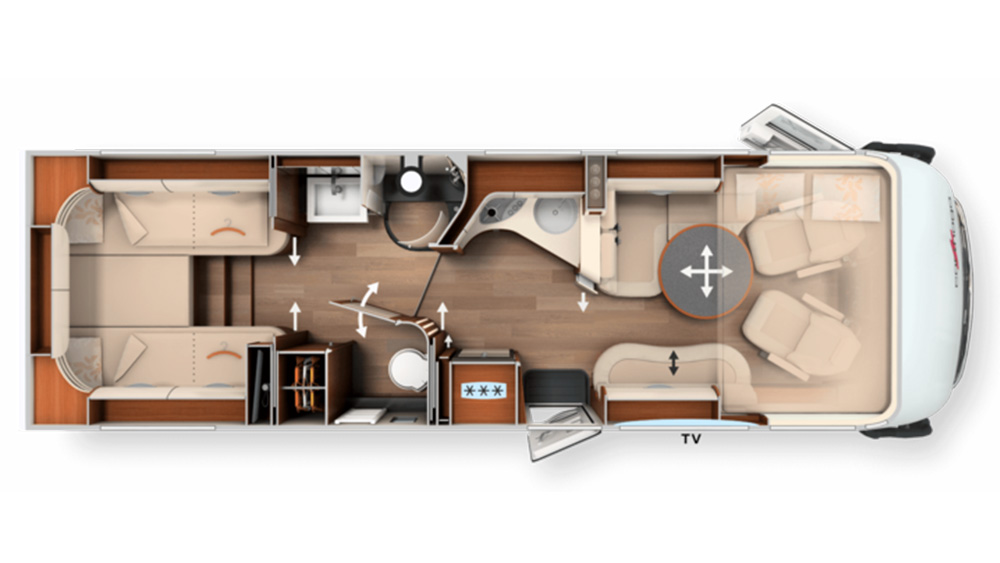 La zona notte offre il massimo del comfort, con grandi letti singoli longitudinali dotati di gradino estraibile per un facile accesso. Gli armadi guardaroba sotto i letti offrono una generosa capacità di stoccaggio, mentre l'armadio TV nella camera da letto aggiunge un tocco di lusso e praticità.