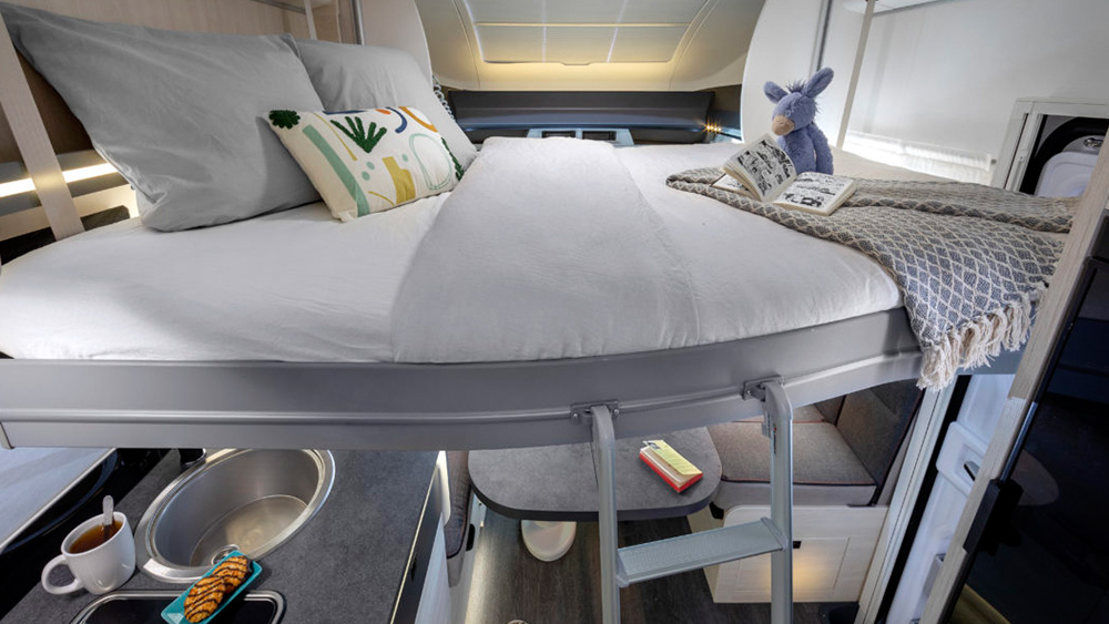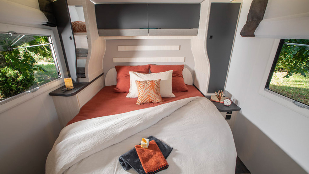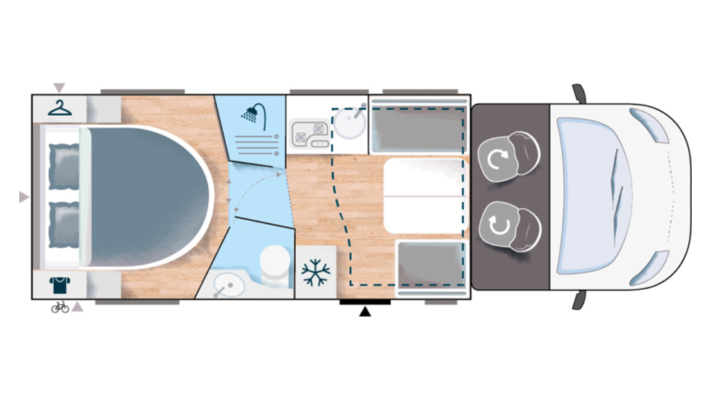 L'innovativo "Smartlounge" frontale è progettato per ottimizzare lo spazio abitativo, offrendo una zona salotto multifunzionale che si trasforma facilmente in una zona pranzo o un ulteriore letto quando necessario. Il bagno con doccia, dotato di una doppia parete divisoria, garantisce privacy e comfort durante l'igiene personale.