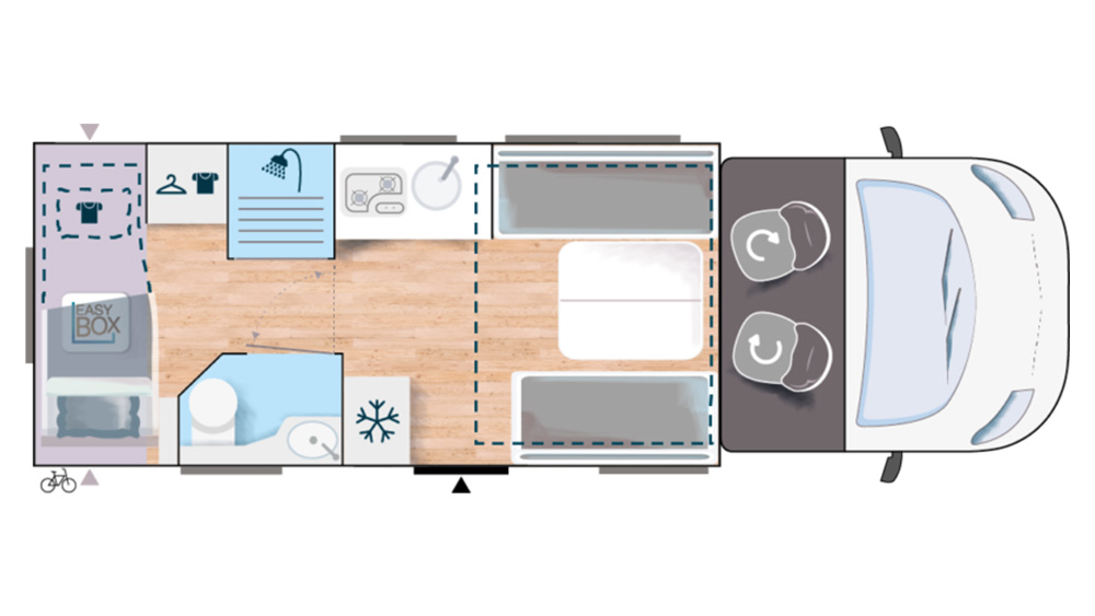La comodità è garantita anche dagli accessori inclusi, come il materasso comfort per il letto principale, il pre-equipaggiamento TV e l'armadio per riporre gli effetti personali. Per i momenti di relax all'aperto, il camper dispone di una tenda da sole esterna, una presa doccia esterna e una pedana doccia per godersi al meglio la vita all'aria aperta.