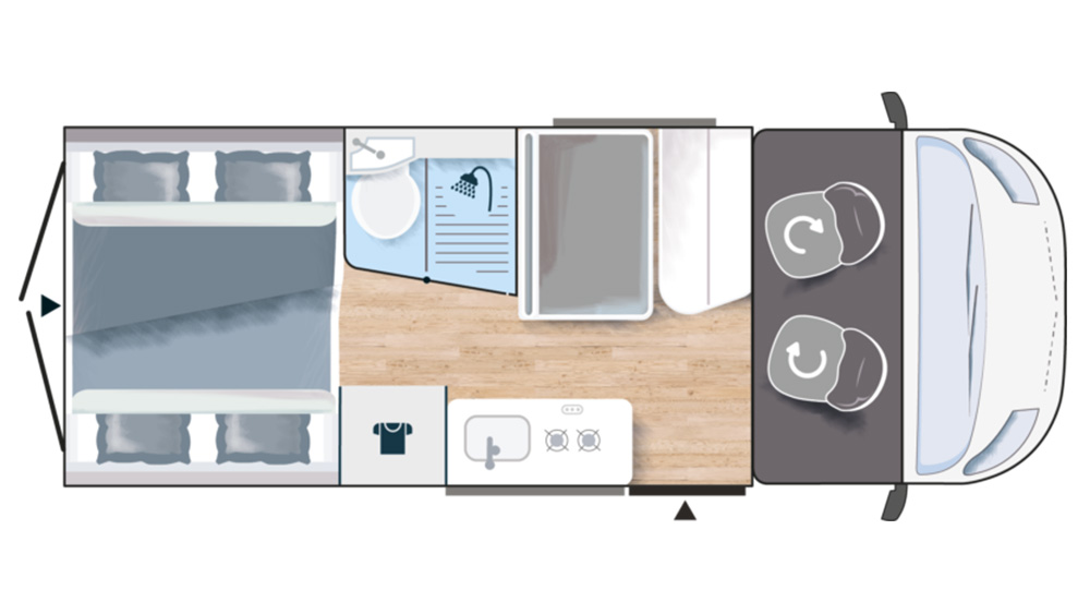 Perfetto per le lunghe soste in natura, il camper è equipaggiato con oscuranti isotermici interni alla cabina, mentre la presa USB e il pre-equipaggiamento TV assicurano il divertimento e la connettività durante il soggiorno. I cerchi in acciaio Dark Grey da 16" garantiscono una guida stabile e sicura su qualsiasi terreno, mentre il bagno con finestra e le finestre posteriori apribili offrono comfort e ventilazione.