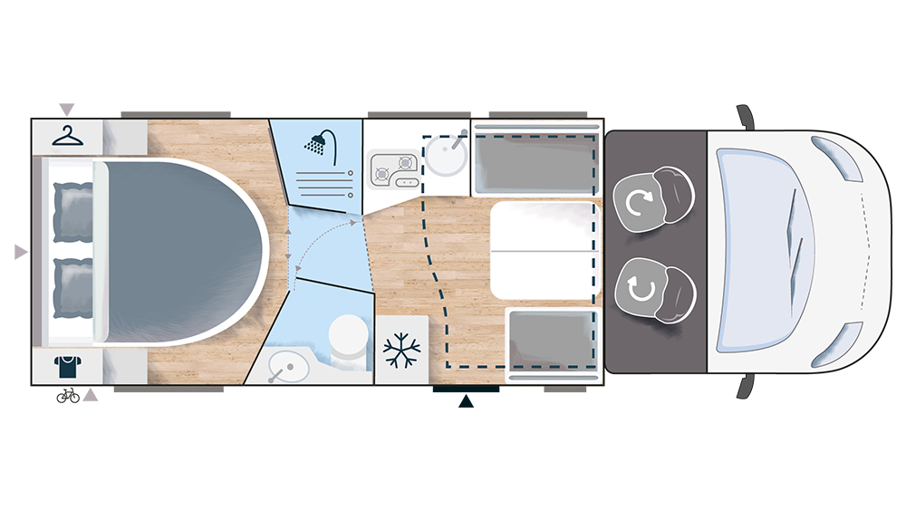 L'area esterna offre pratiche funzionalità come prese USB, presa acqua e gas esterna, e una doccia esterna con flessibile. La porta d’ingresso è di tipo "lusso" con chiusura centralizzata. Per un soggiorno confortevole, sono disponibili un ampio armadio, spogliatoio con cassetti, e una pedana doccia. Il camper è inoltre predisposto per l’installazione di una telecamera di retromarcia e di un pannello solare, offrendo così ulteriori possibilità di personalizzazione e autonomia durante i viaggi.