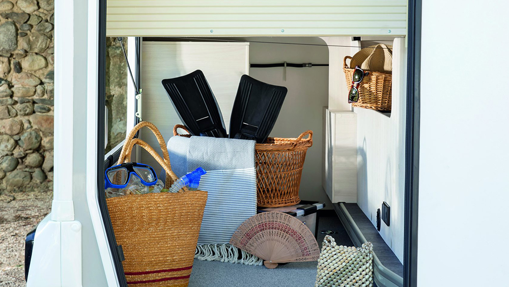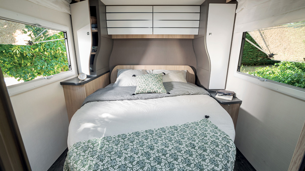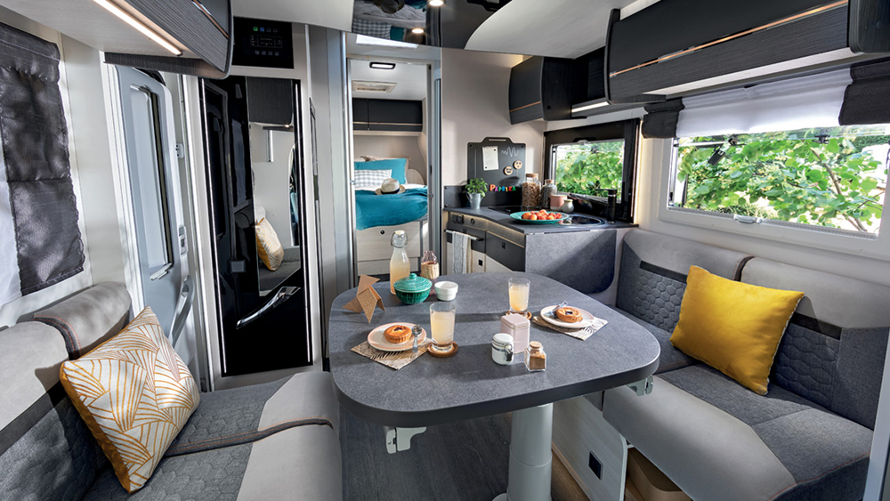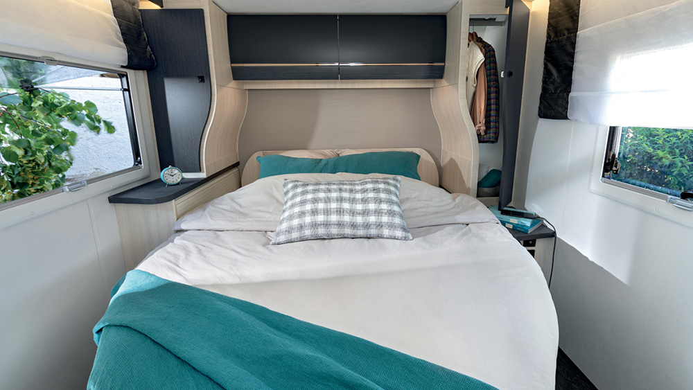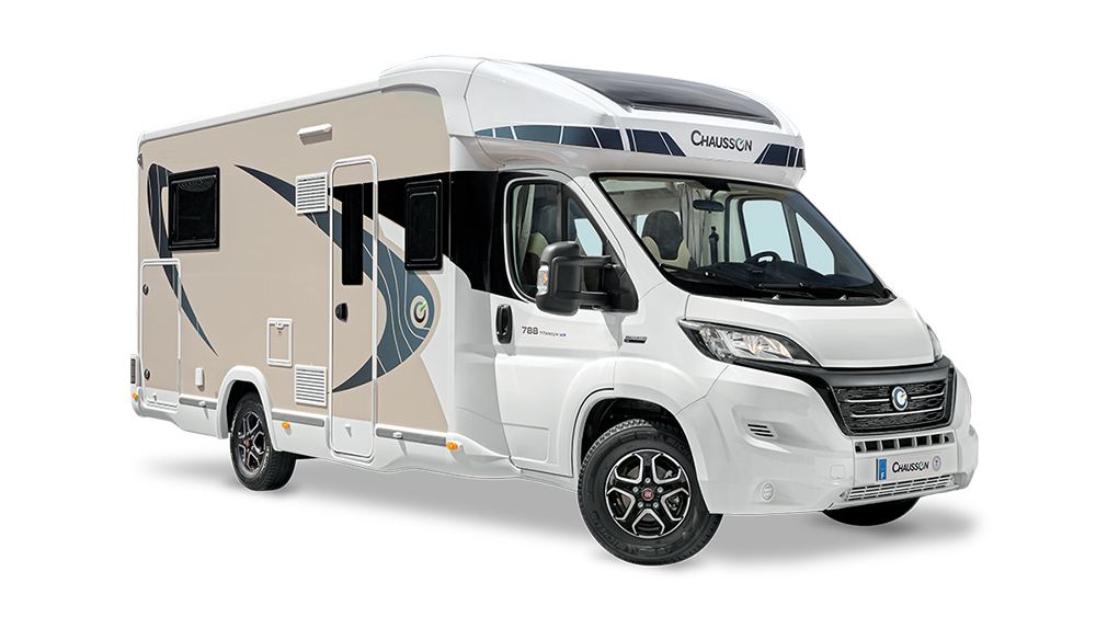 Il Chausson 788 Titanium Ultimate vanta una struttura robusta in poliestere con un pavimento spesso 64 mm, assicurando un'ottima coibentazione. L'illuminazione interna è arricchita da LED al pavimento e un tetto panoramico apribile, oltre a oblò panoramici per una maggiore luminosità. Le finestre sono dotate di doppi vetri con oscuranti e zanzariere integrate. Per il comfort notturno, il materasso del letto principale è particolarmente confortevole.