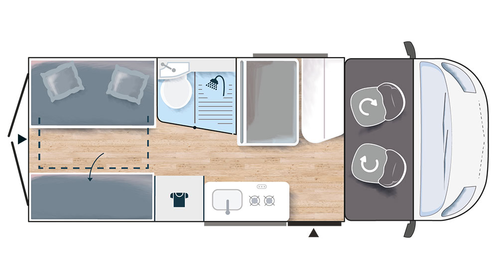 Le finestre a doppio vetro con combinato oscurante/zanzariera e gli oscuranti isotermici interni della cabina assicurano privacy e isolamento termico. È presente una presa USB per ricaricare i dispositivi elettronici. I cerchi in acciaio Dark Grey da 16" conferiscono un tocco di stile, mentre il pre-equipaggiamento TV e il precablaggio per la telecamera di retromarcia aumentano la praticità.