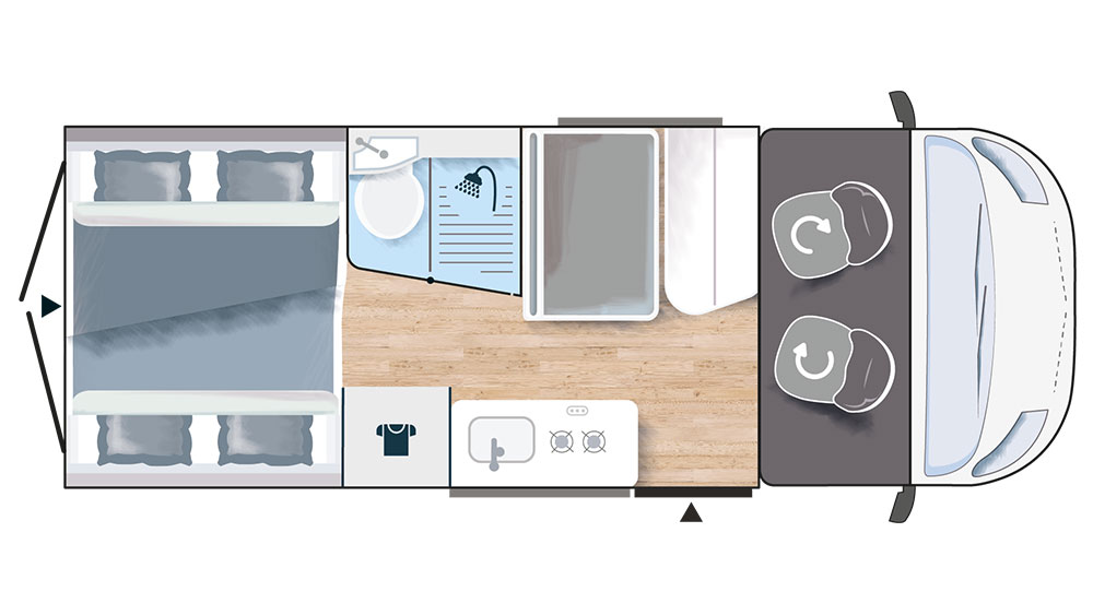 Per la vita di tutti i giorni, il letto posteriore si rialza per creare spazio aggiuntivo, mentre il salotto si converte in un comodo sedile con due cinture di sicurezza, permettendo di viaggiare in quattro con sicurezza e comodità. Il motore 2.2L da 140 CV assicura la potenza necessaria per affrontare ogni tipo di strada, mentre la climatizzazione manuale e gli airbag per conducente e passeggero garantiscono sicurezza e comfort.