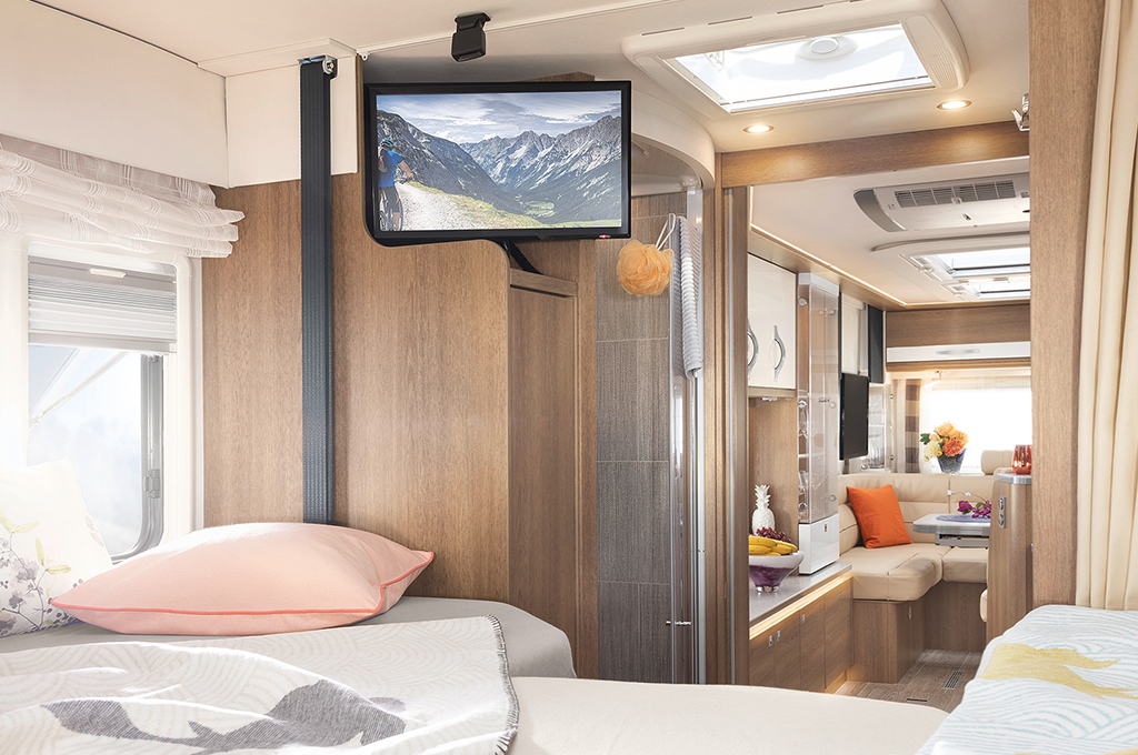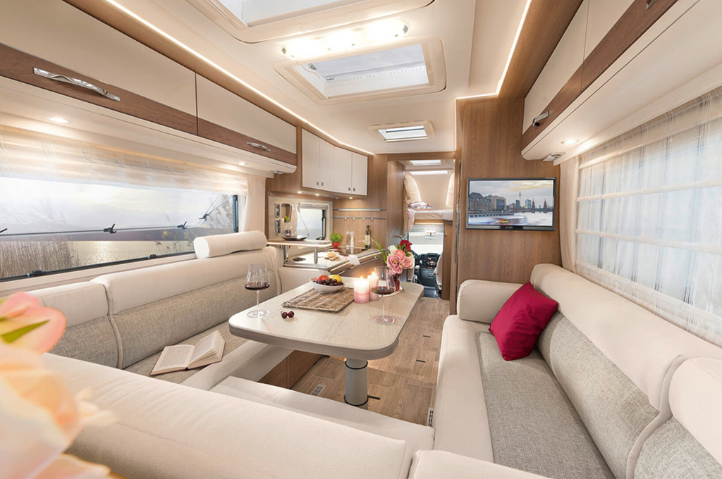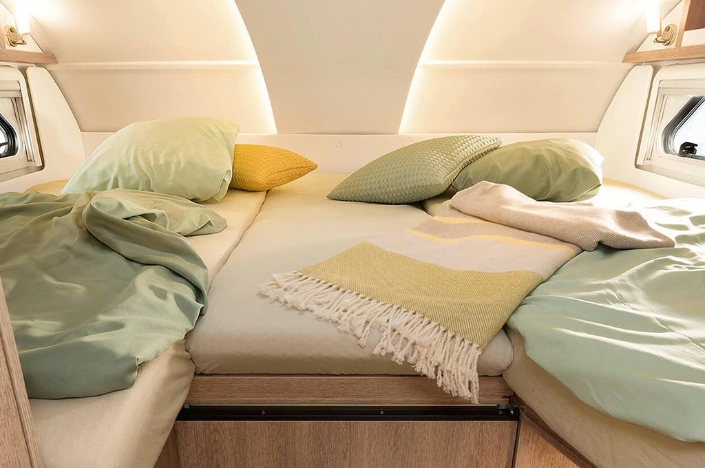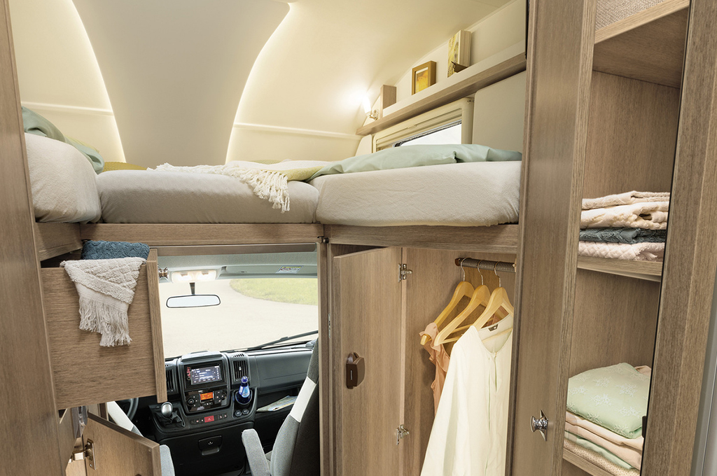 Il camper per le persone che viaggiano in coppia. Con tanto spazio, un'enorme dinette panoramica e comodi letti singoli nella mansarda o letto basculante, questo camper è ideale per viaggiare comodamente in coppia. Adatto a tutte le temperature grazie al doppio pavimento riscaldato con installazione antigelo per l'acqua.