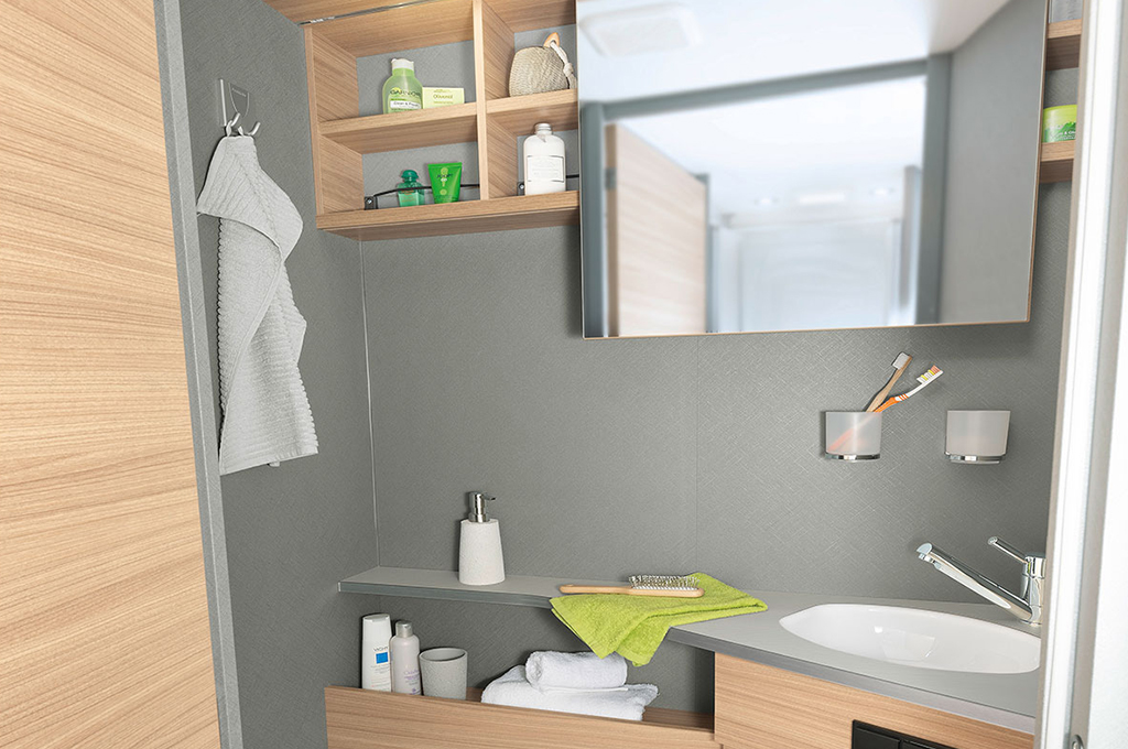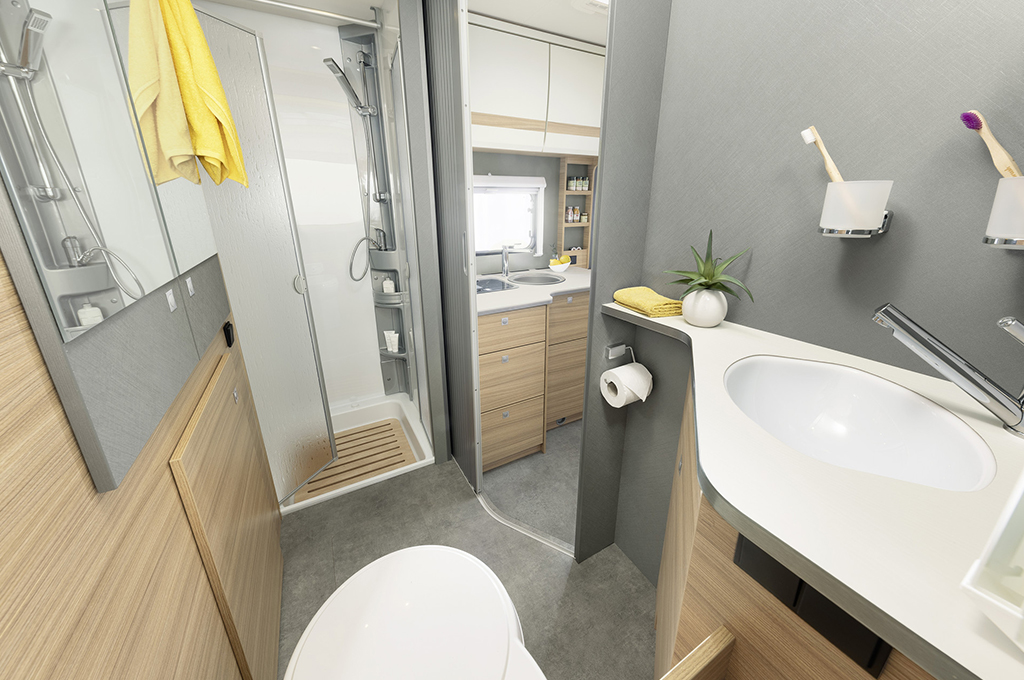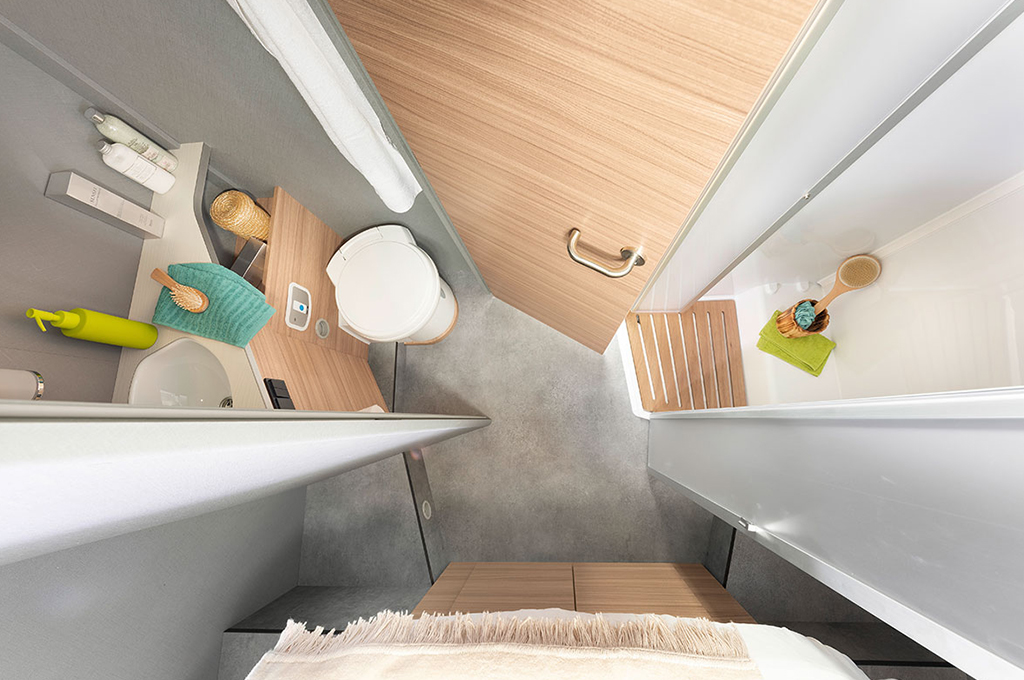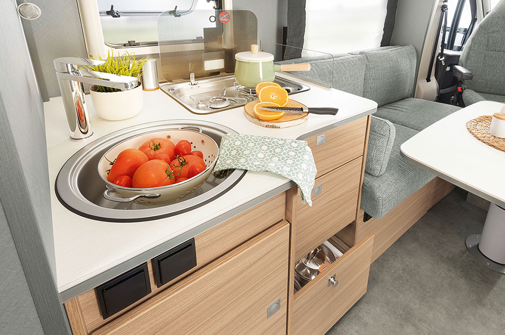 La cucina è un paradiso per i cuochi itineranti, con un piano cottura a 2 fuochi e ampi spazi per stoviglie e utensili. Il bagno, esteso su tutta la larghezza del veicolo, offre una doccia separata e un armadio spazioso, garantendo comfort e praticità. Per completare l'esperienza, l'arredamento moderno e l'illuminazione "Light Moments" creano un'atmosfera accogliente e rilassante.