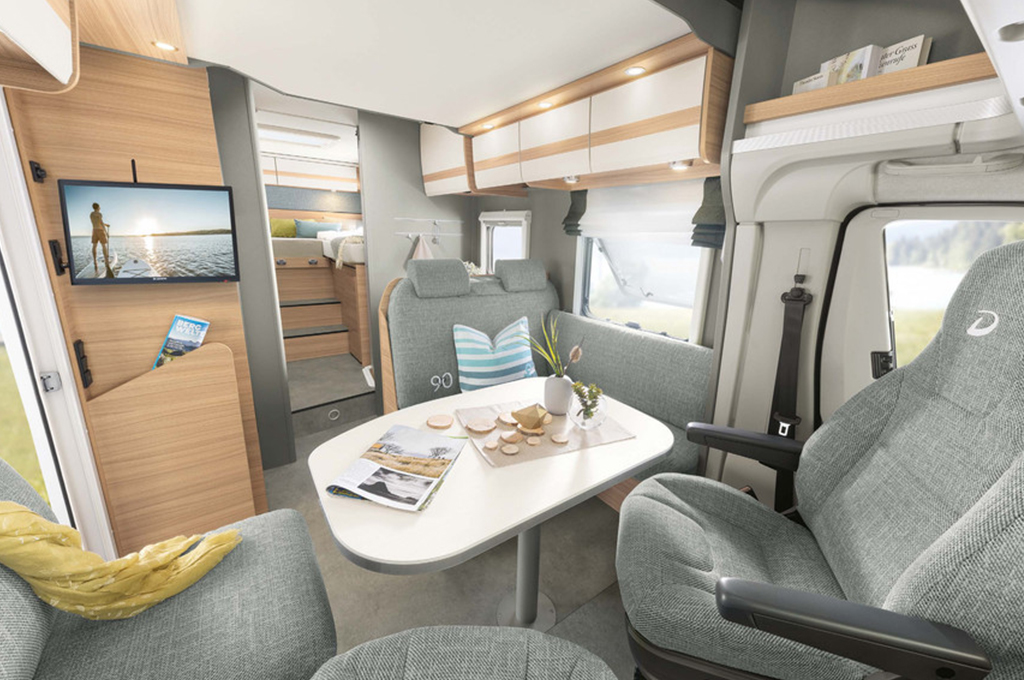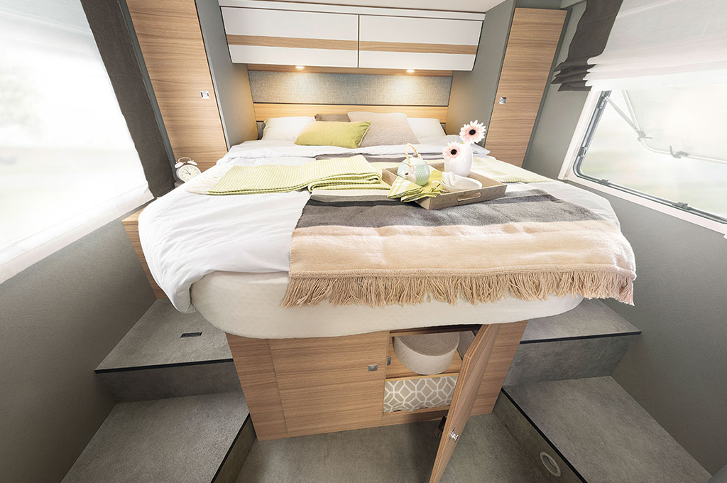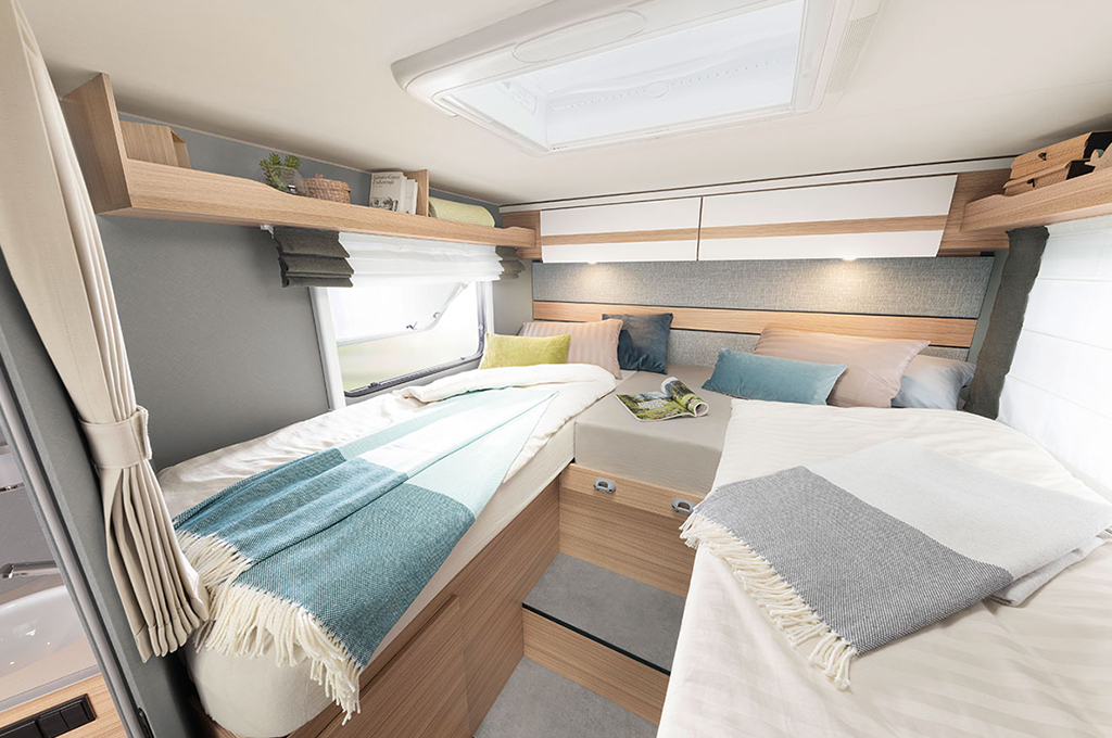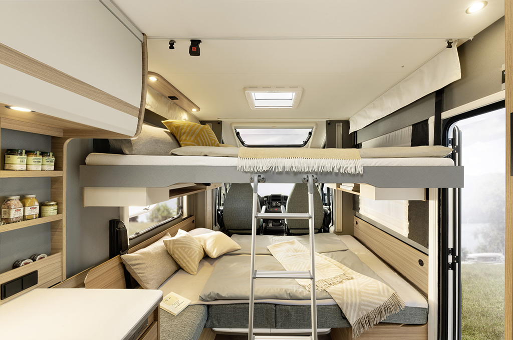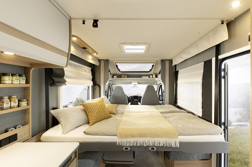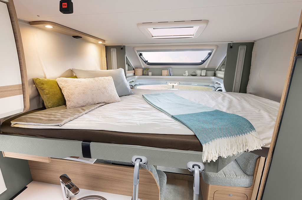 Uno dei punti di forza è il letto basculante opzionale, che offre una superficie spaziosa di 200 x 150 cm e può essere abbassato facilmente, garantendo un riposo di qualità senza compromettere lo spazio vitale. I faretti LED con funzione touch illuminano sia la zona giorno che la zona notte, mentre i sistemi di sicurezza avanzati come ESP e sensori di pressione degli pneumatici assicurano una guida sicura e tranquilla.