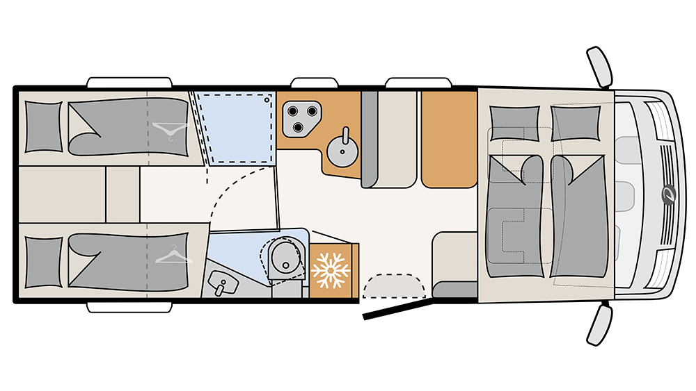 All'esterno, il cupolino aerodinamico con finestra a compasso non solo migliora l'estetica, ma ottimizza anche l'aerodinamica per una guida più fluida. I portelloni posteriori a sinistra e a destra consentono un accesso comodo e sicuro allo spazio di carico. La costruzione della cellula con tecnologia Lifetime Smart assicura robustezza e durabilità, con materiali resistenti agli agenti atmosferici come la vetroresina.