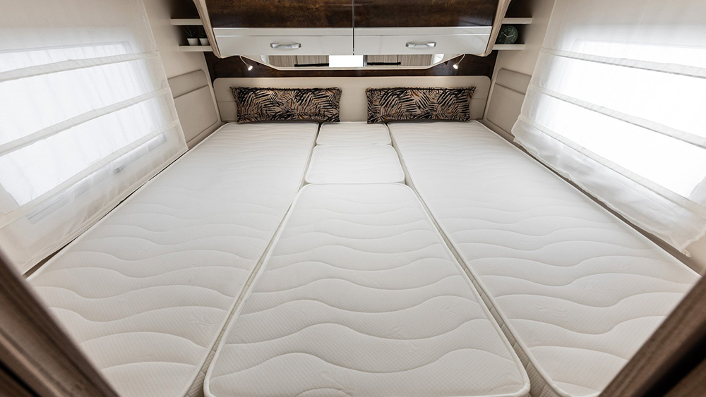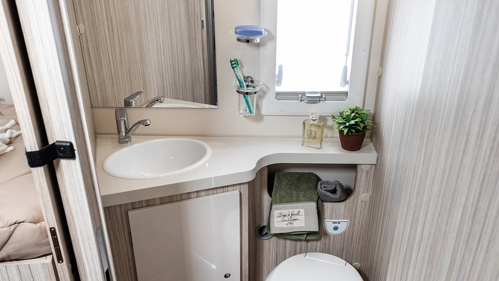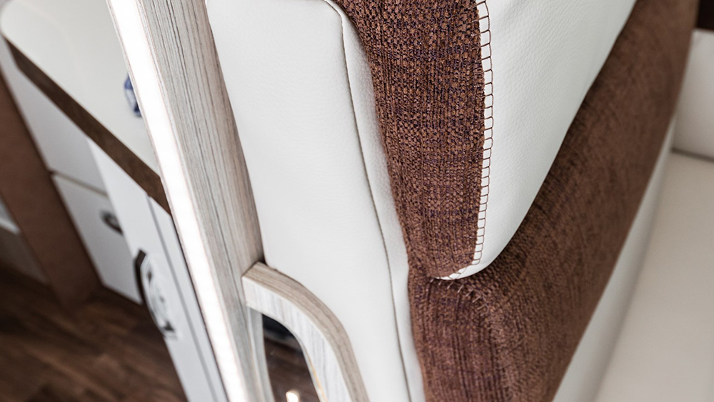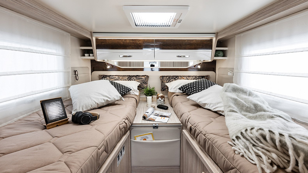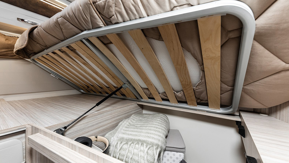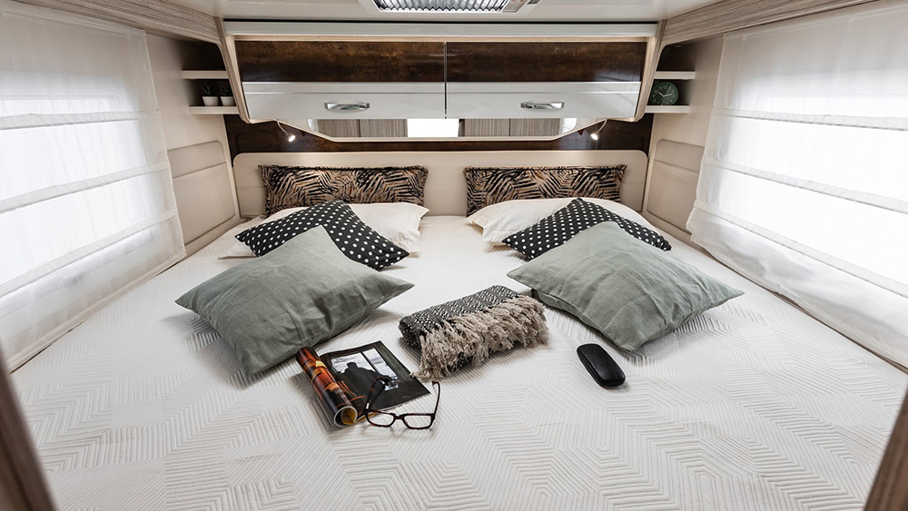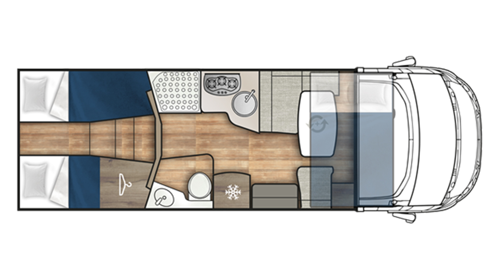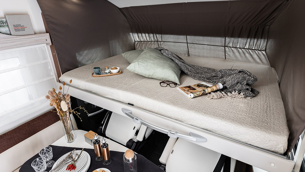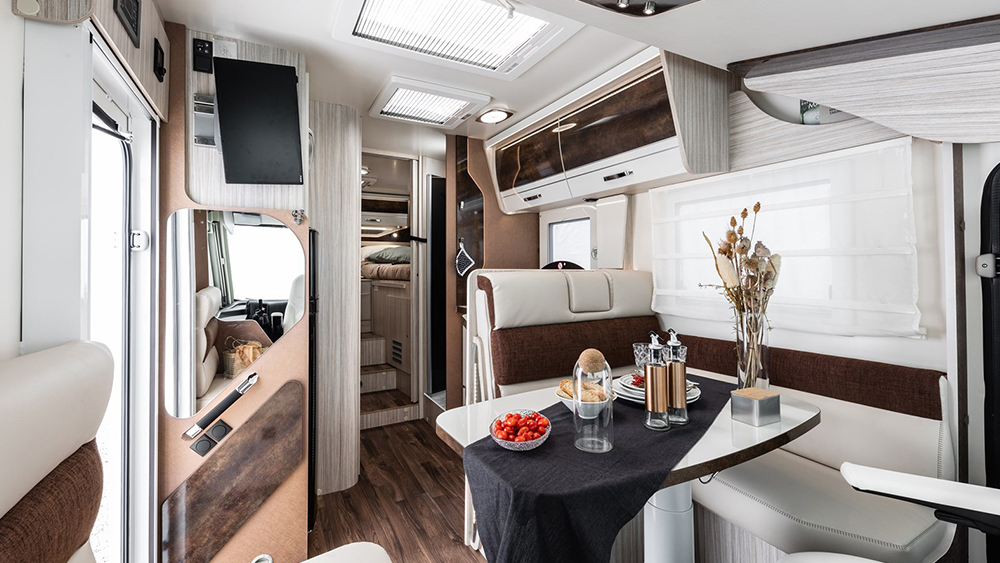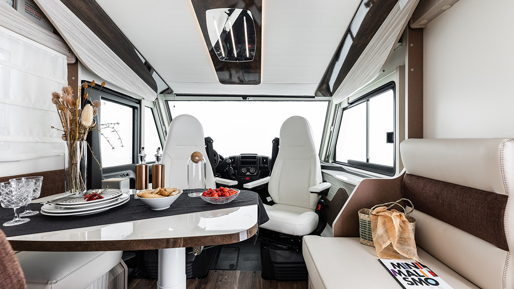 All'interno, la dinette spaziosa e confortevole è il cuore pulsante di Magnum 530, con finiture in legno chiaro e laminato lucido che conferiscono un'eleganza classica. Le ampie finestre e gli oblò permettono una vista panoramica mozzafiato, mentre il letto basculante elettrico salvaspazio assicura un riposo rigenerante.