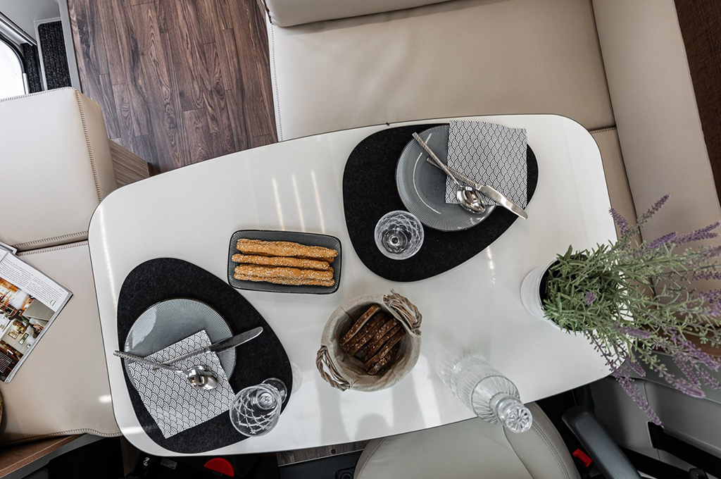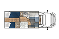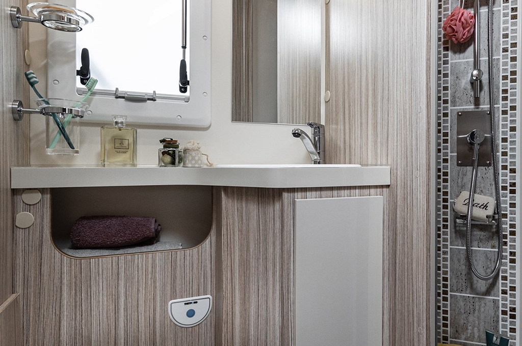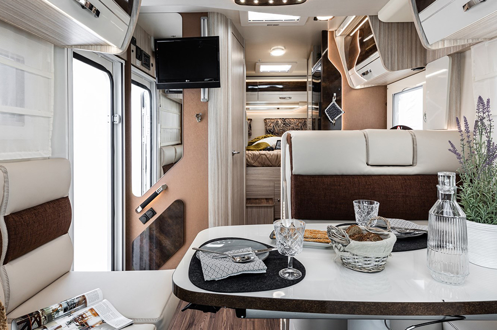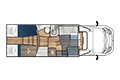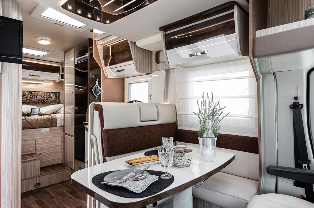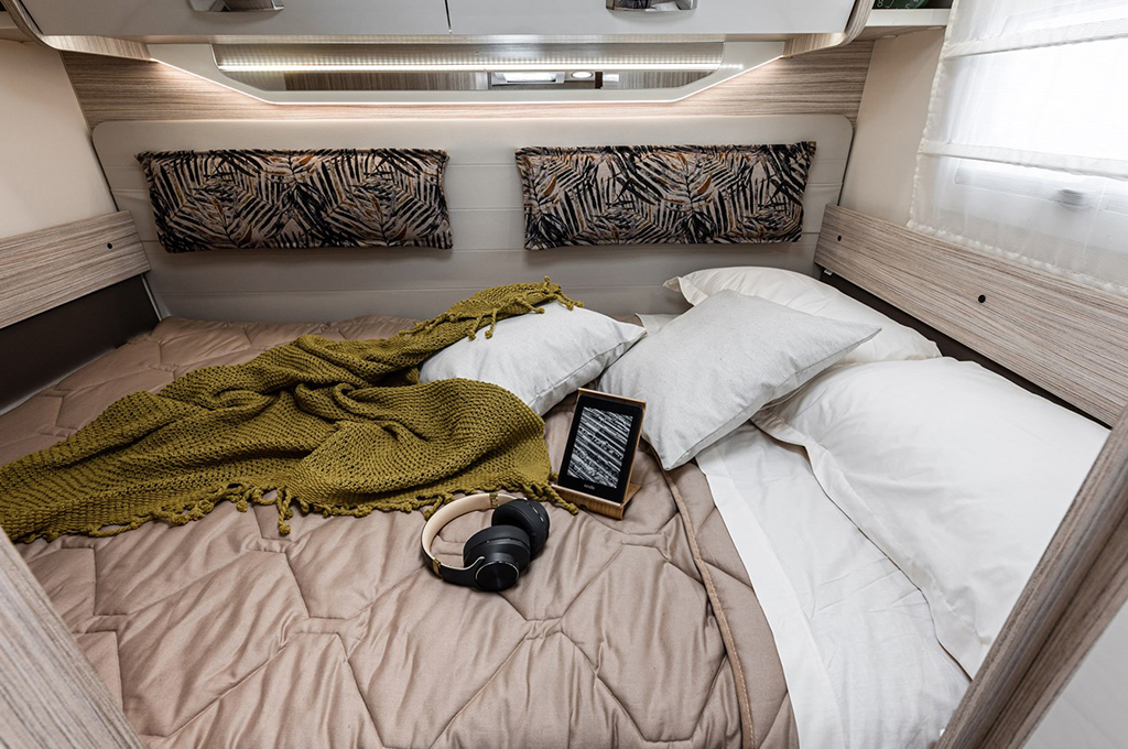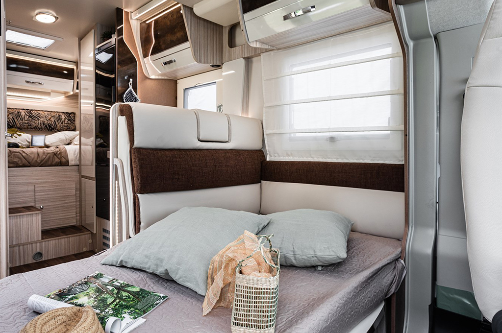 Nella zona giorno, ampie finestre e oblò illuminano gli ambienti, mentre il mobilio in legno chiaro con venature grigie e le tappezzerie coordinate trasmettono armonia e stile. I tavoli multifunzionali, alcuni con rotazione a 360°, e le sedute Isofix aggiungono versatilità e praticità allo spazio. L'illuminazione a LED e le dotazioni tecnologiche come il riscaldamento Combi 4 Diesel e il pannello comandi CP Plus migliorano ulteriormente l'esperienza abitativa.