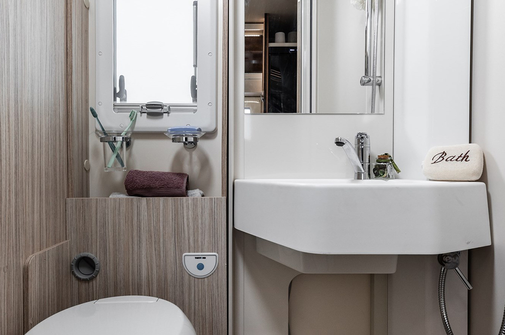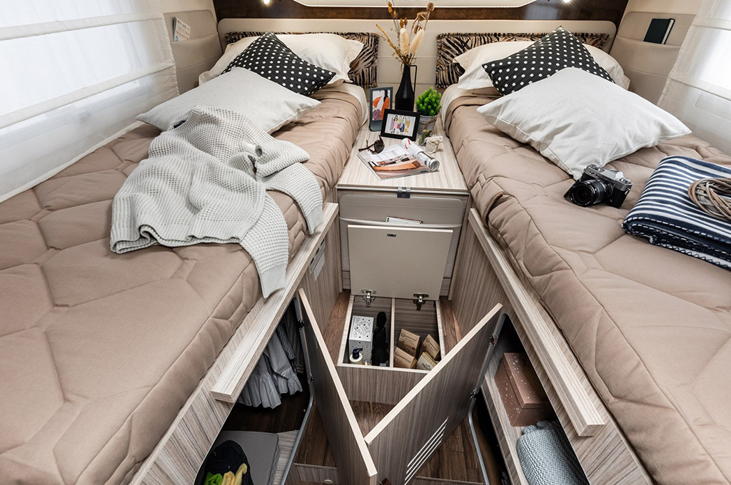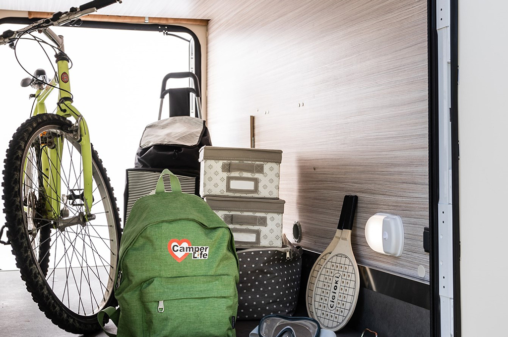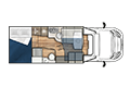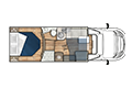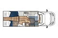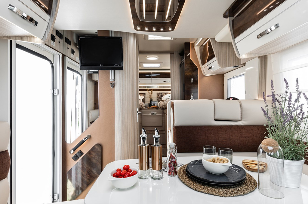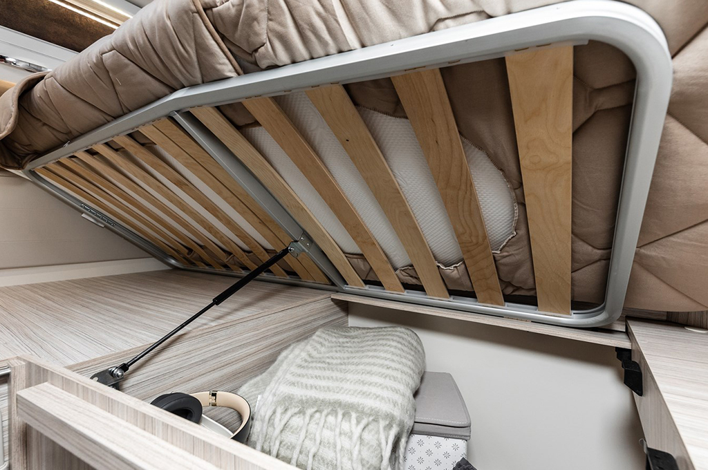 Nella zona giorno, ampie finestre e oblò illuminano gli ambienti, mentre il mobilio in legno chiaro con venature grigie e le tappezzerie coordinate trasmettono armonia e stile. I tavoli multifunzionali, alcuni con rotazione a 360°, e le sedute Isofix aggiungono versatilità e praticità allo spazio. L'illuminazione a LED e le dotazioni tecnologiche come il riscaldamento Combi 4 Diesel e il pannello comandi CP Plus migliorano ulteriormente l'esperienza abitativa.