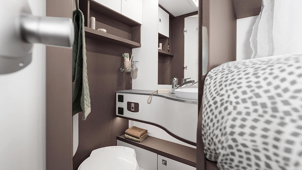Il bagno, progettato con cura per offrire comfort e praticità, accoglie con una disposizione intelligente degli spazi, dove ogni elemento è sempre a portata di mano. Qui, il risveglio si trasforma in un rituale di benessere, preparando il terreno per una giornata all'insegna del relax e dell'avventura.