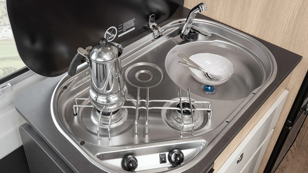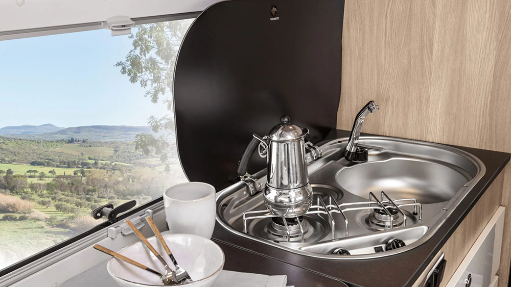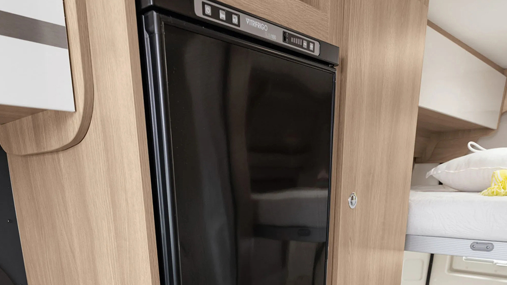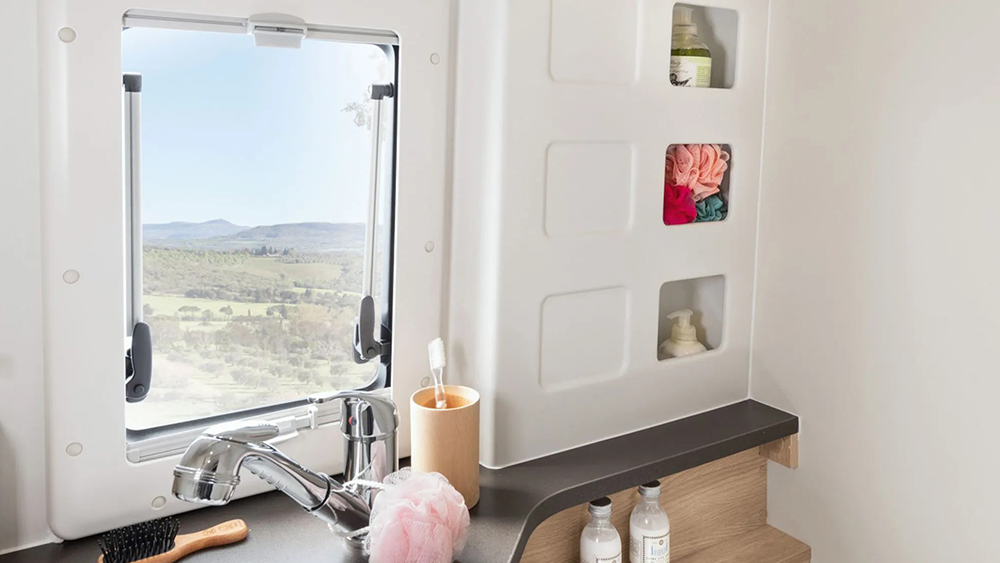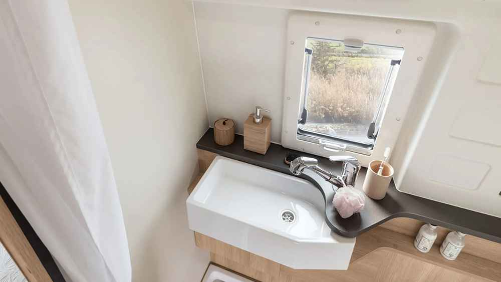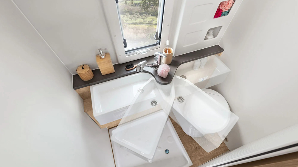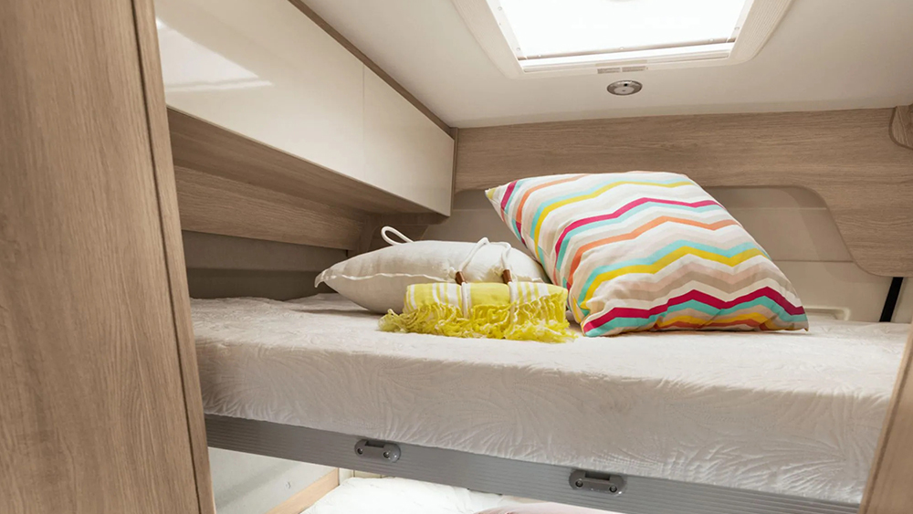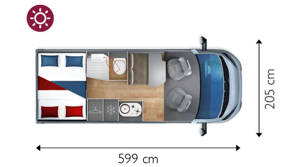 GiottiVan 60B offre una varietà di colori esterni, permettendo ai proprietari di scegliere quello che meglio si adatta ai loro gusti. Le finestre sono dotate di cornici a pacchetto modello Seitz, garantendo un'eccellente illuminazione naturale e ventilazione. All'interno, il bagno è attrezzato con una doccia e un lavandino ruotabile, mentre il grande guardaroba a due ante offre ampio spazio per riporre abbigliamento e accessori.