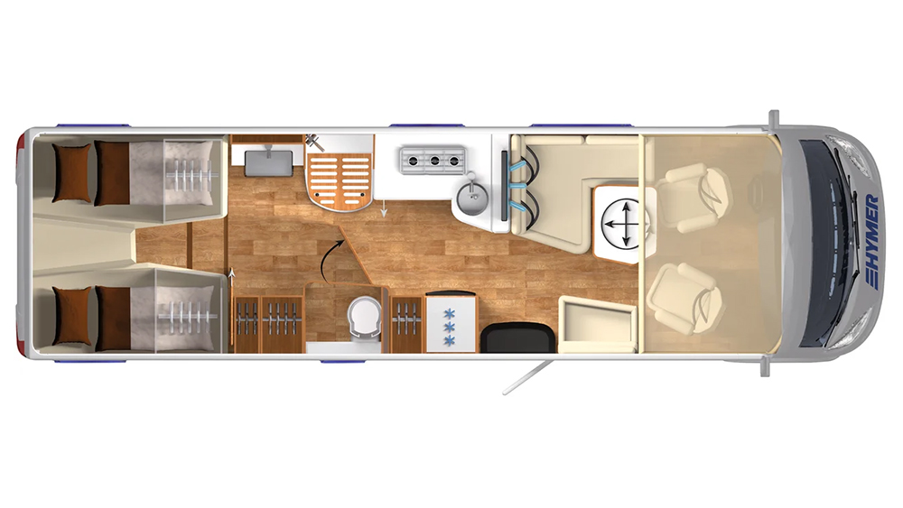 Uno dei suoi tratti distintivi è il doppio pavimento multifunzione alto 36 cm, che non solo aumenta lo spazio di stivaggio, ma migliora anche l'isolamento termico, assicurando comfort in ogni stagione. Il telaio innovativo SLC assicura stabilità e comfort grazie alle sospensioni a ruote indipendenti, mentre la HYMER Connect App consente un controllo intuitivo dei componenti della cellula da remoto.