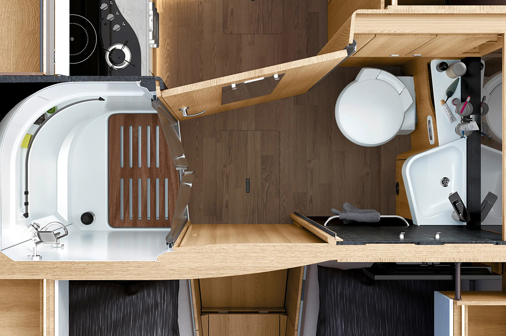 Il telaio SLC innovativo con superficie di calpestio piana assicura una stabilità di guida superiore e un comfort impareggiabile grazie alle sospensioni indipendenti. Il doppio pavimento multifunzione da 36 cm, privo di scalini, offre ampi spazi di stivaggio, miglior isolamento termico e resistenza al freddo. La HYMER Connect App permette un controllo intuitivo del veicolo da qualsiasi luogo, mentre l'ampia porta di ingresso comfort da 65 cm facilita l'accesso.