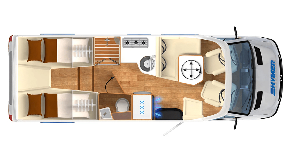 Con un doppio pavimento multifunzione alto 36 cm, il ModernComfort T offre spazio di stivaggio extra, un eccellente isolamento e una resistenza al freddo senza pari. Grazie alla HYMER Connect App di serie, è possibile controllare e gestire comodamente tutti i componenti della cellula da qualsiasi luogo. Con serbatoi da 180 l per l'acqua dolce e 150 l per le acque grigie, assicura autonomia e libertà estese, anche su veicoli più compatti sotto i 7 metri.
