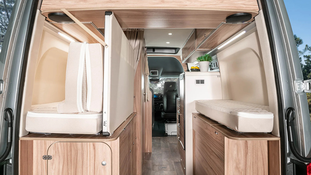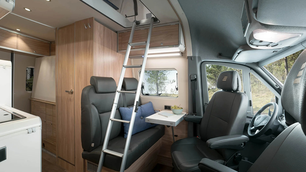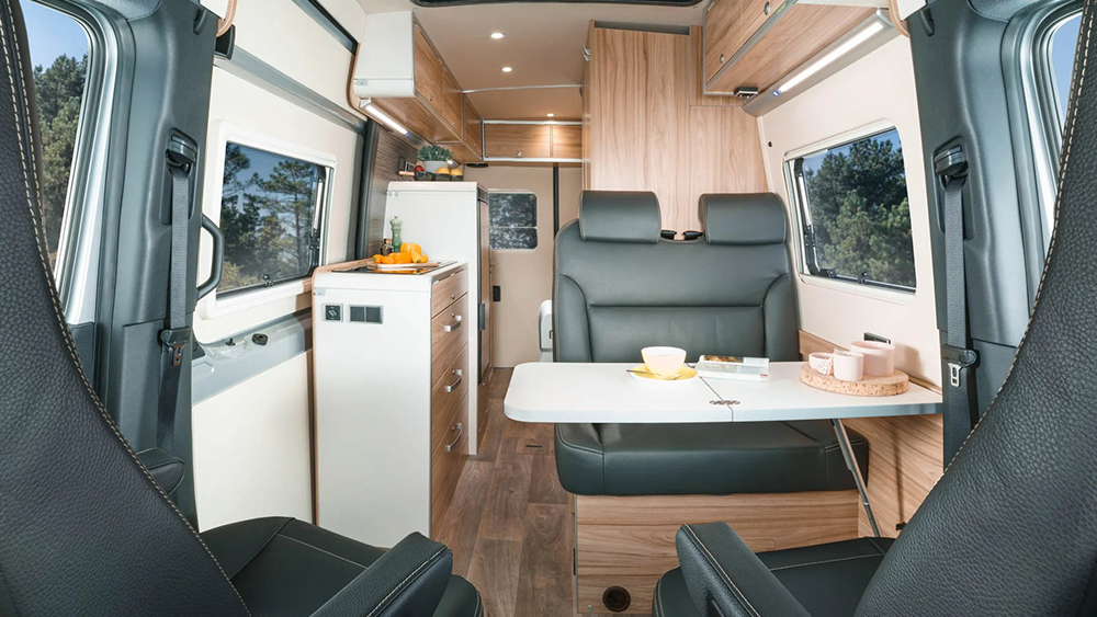 L'interno del Grand Canyon S è un trionfo di eleganza e praticità. Ogni dettaglio è pensato per esprimere qualità e individualità, rendendo lo spazio abitativo non solo bello da vedere, ma anche estremamente funzionale. La zona salotto è progettata per adattarsi alle esigenze personali di ogni viaggiatore, con un tavolo agganciabile più grande e sedili confortevoli.
