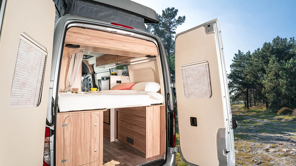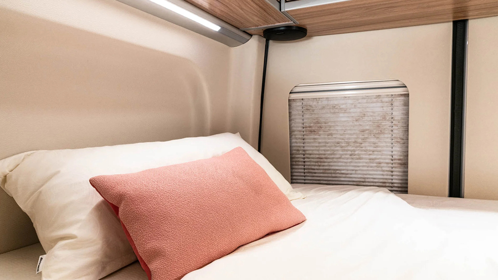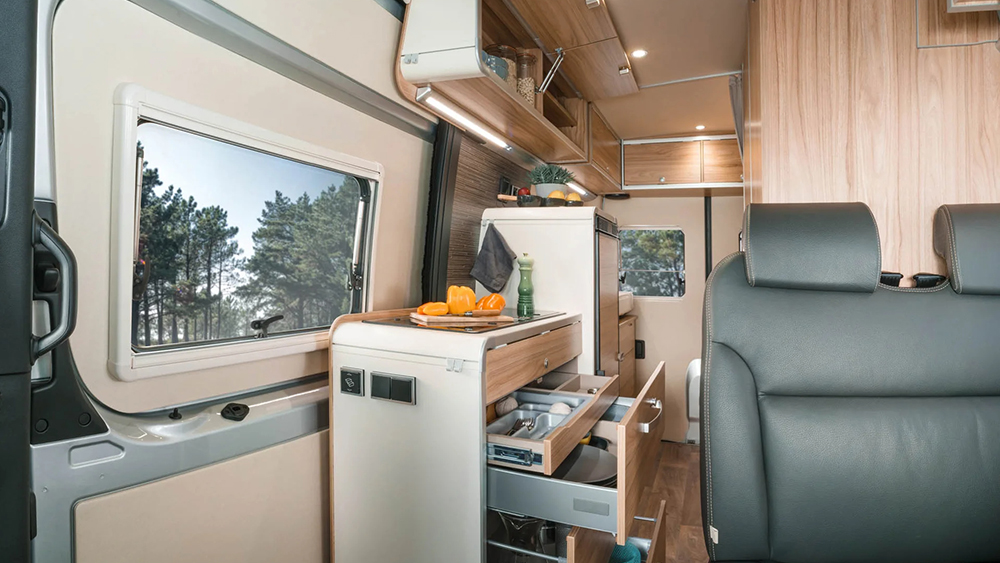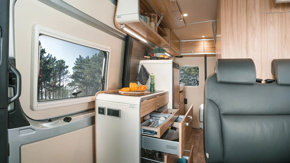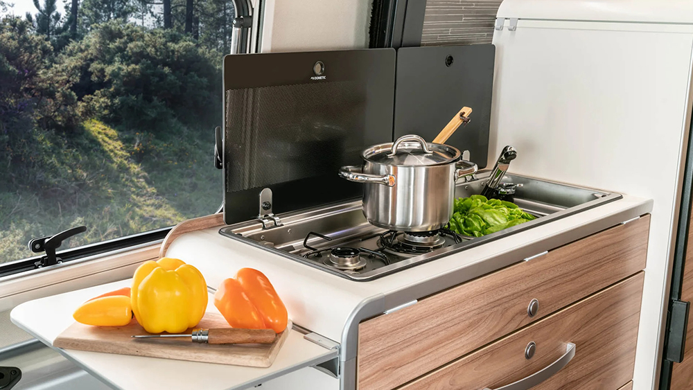 La cucina, con il suo nuovo piano di lavoro estensibile, offre ampio spazio per preparare pasti deliziosi durante le serate in vacanza. La zona notte è altrettanto versatile, con un materasso estraibile che assicura un riposo rigenerante e, durante il giorno, può essere trasformata in un pratico spazio di stivaggio.