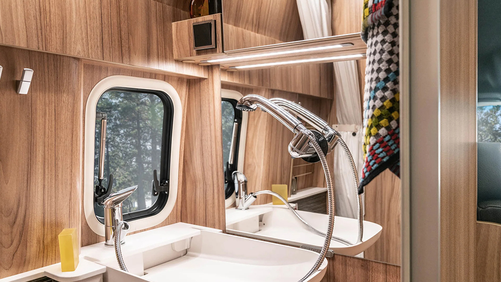 Il bagno, dotato di un lavandino ripiegabile, ottimizza l'uso dello spazio a seconda delle necessità del momento. Inoltre, grazie all'autonomia ampliata di serie e alla trazione integrale opzionale, il Grand Canyon S permette di raggiungere qualsiasi destinazione, fermandosi solo quando lo si desidera veramente.