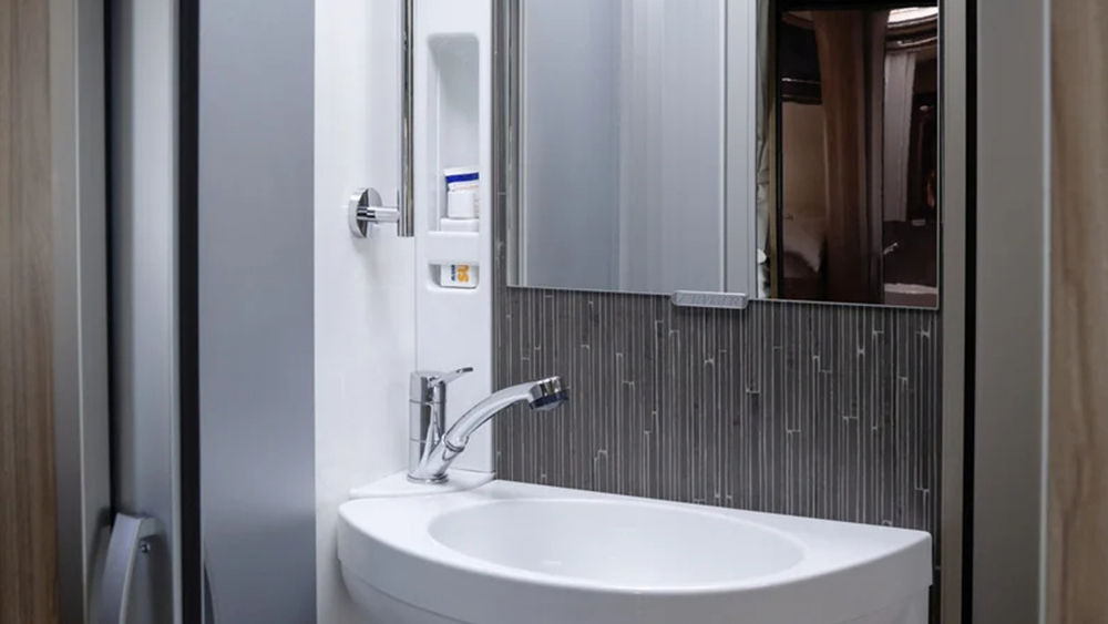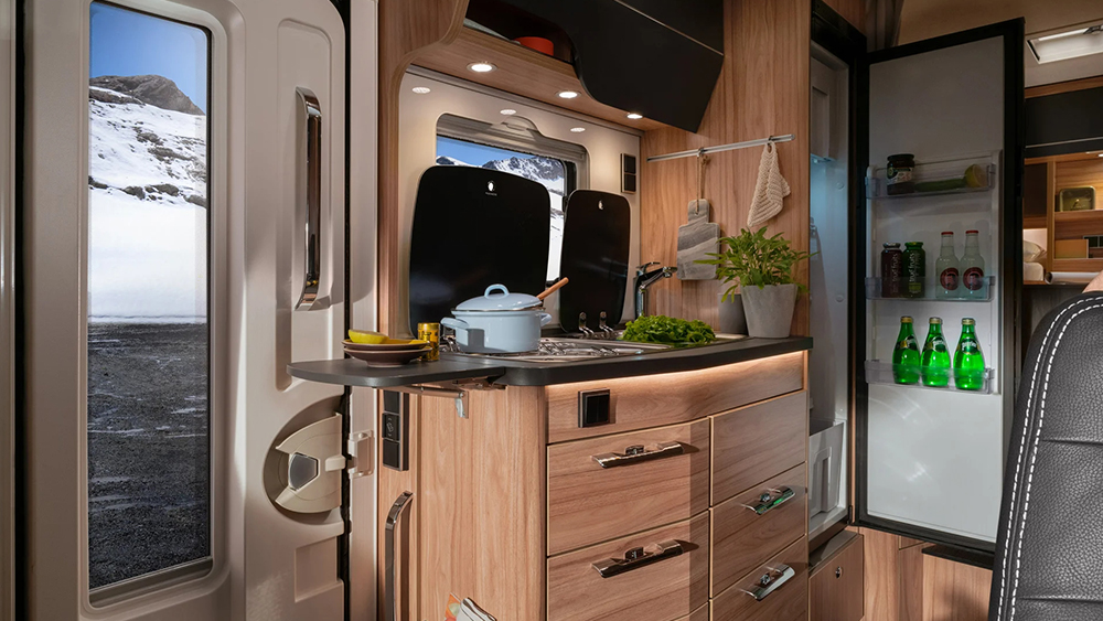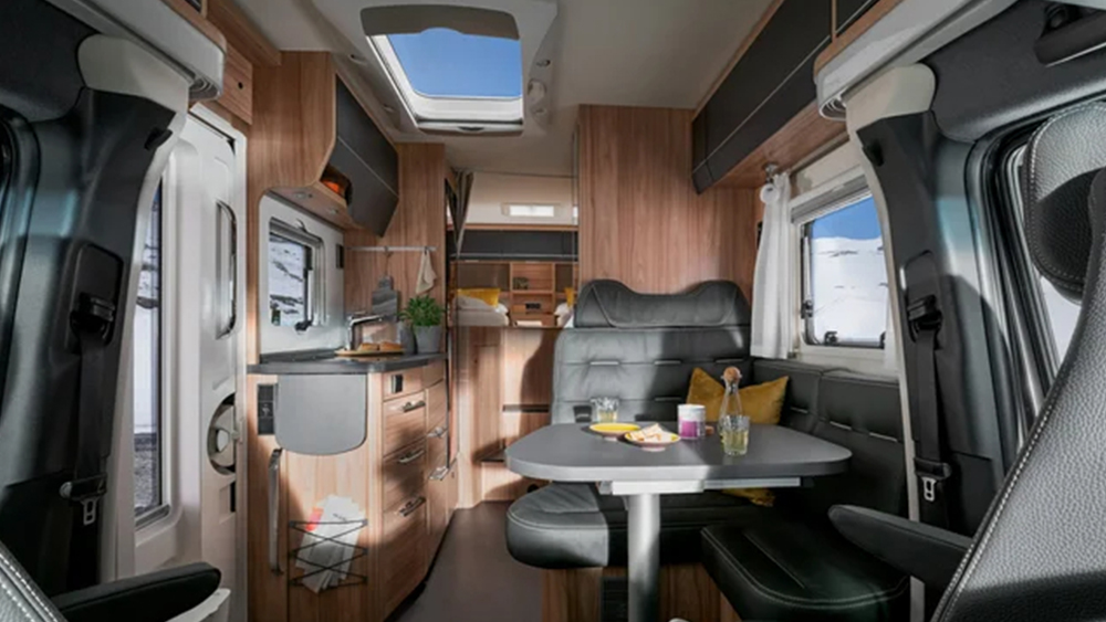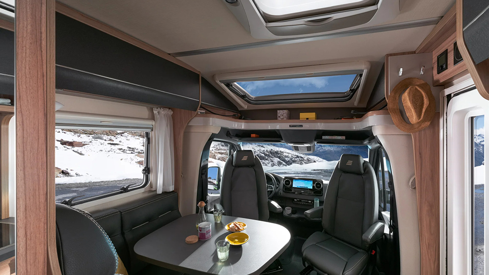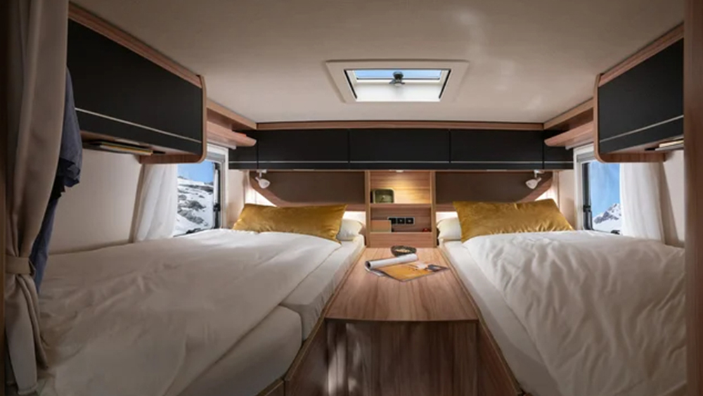 All'interno, l'abitacolo è un'armoniosa combinazione di praticità e stile, con dettagli come i pensili grigio scuro e la finitura grigia del tavolo che contribuiscono a un ambiente accogliente e funzionale. I confortevoli letti singoli longitudinali nella zona posteriore, trasformabili in un ampio piano letto, assicurano un riposo notturno di qualità ovunque ci si fermi.
