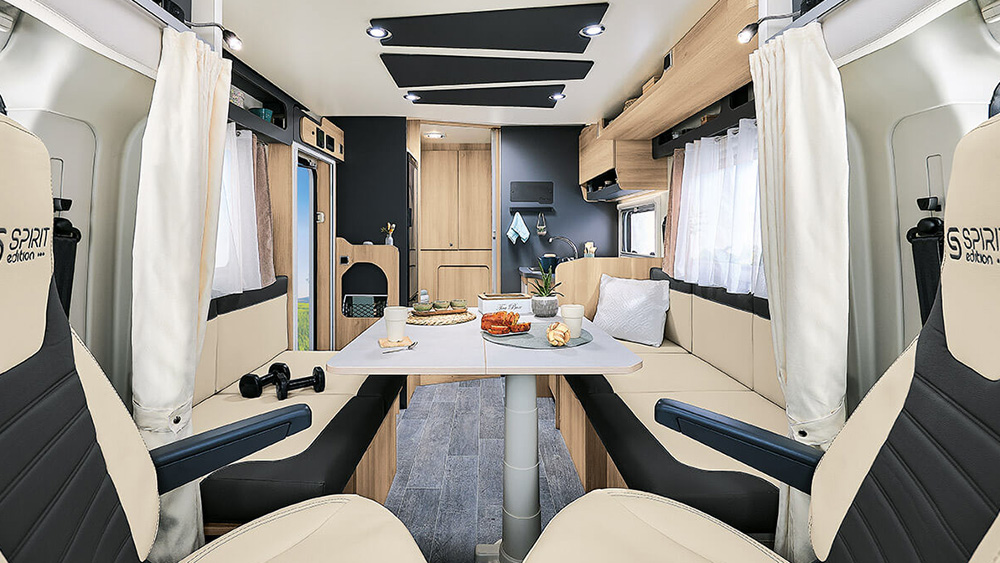 La decorazione esterna Spirit Edition aggiunge un tocco di stile distintivo al veicolo, con barre cromate sulla griglia paraurti e cerchi in lega leggera da 16 pollici che conferiscono un aspetto moderno ed elegante. La selleria TEP unica con ricamo Spirit Edition e altri dettagli di design come la cornice finestra retroilluminata e i montanti posteriori con luci a LED completano l'aspetto raffinato di questo camper.