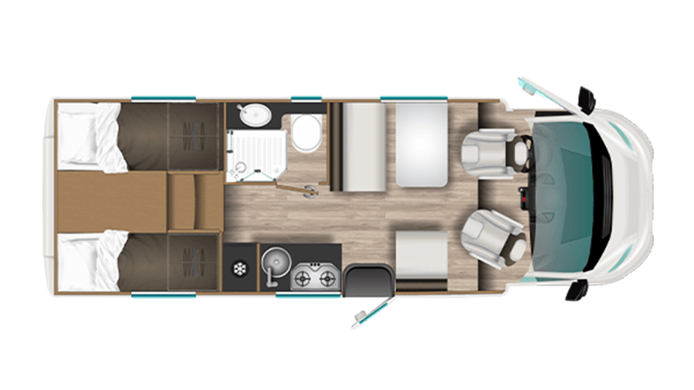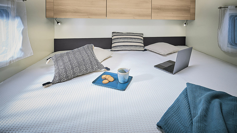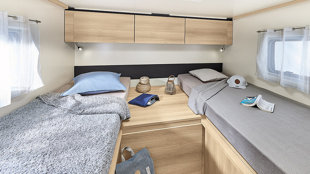 I letti gemelli, trasformabili in un letto XXL, assicurano notti riposanti e spaziose, mentre il letto basculante elettrico integrato offre ulteriore comodità con la sua ampia superficie. Il salotto convertibile aggiunge flessibilità, trasformandosi in un posto letto supplementare quando necessario. Il guardaroba ai piedi del letto e il grande gavone offrono ampio spazio di archiviazione per bagagli e attrezzature.