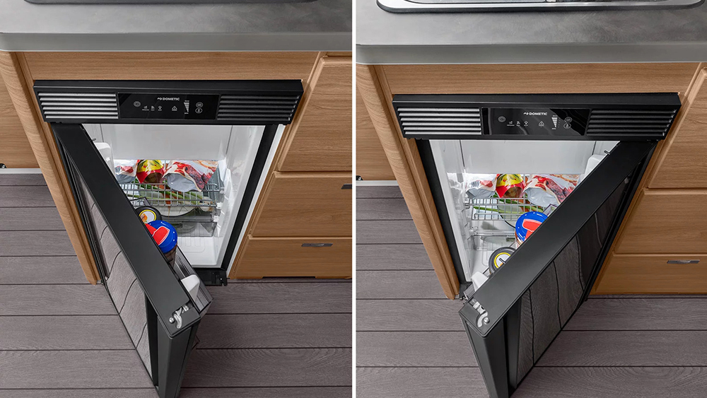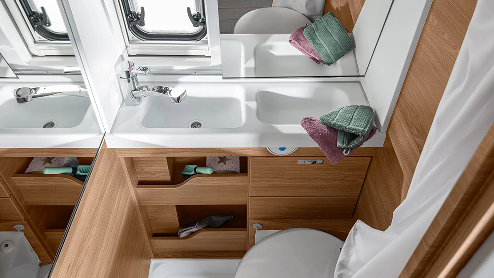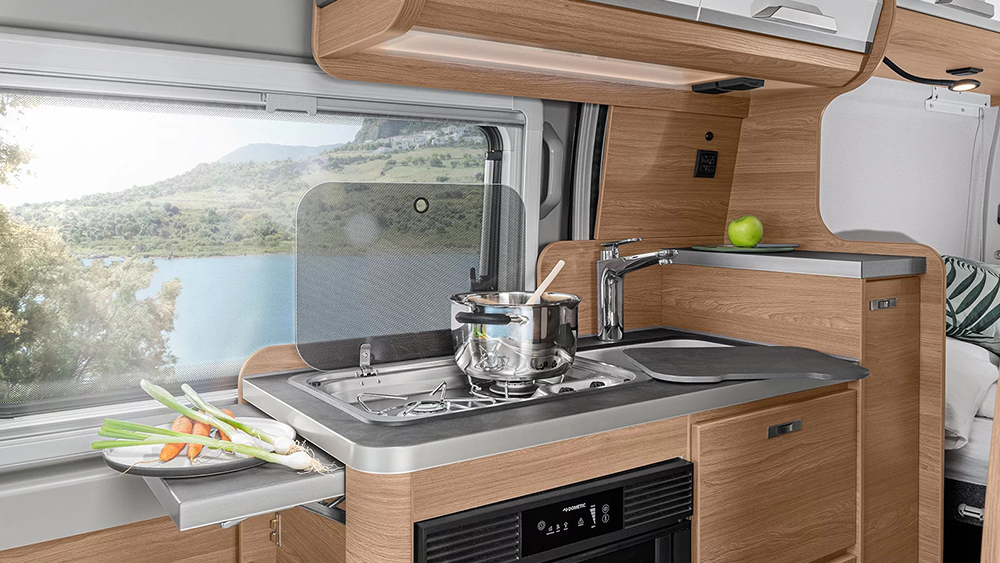Il Boxlife 540 MQ include anche una cucina ben attrezzata con frigorifero a compressore da 70 litri, fornello a 2 fuochi e un bagno completo con WC a cassetta THETFORD e doccia innovativa con tenda d'aria.