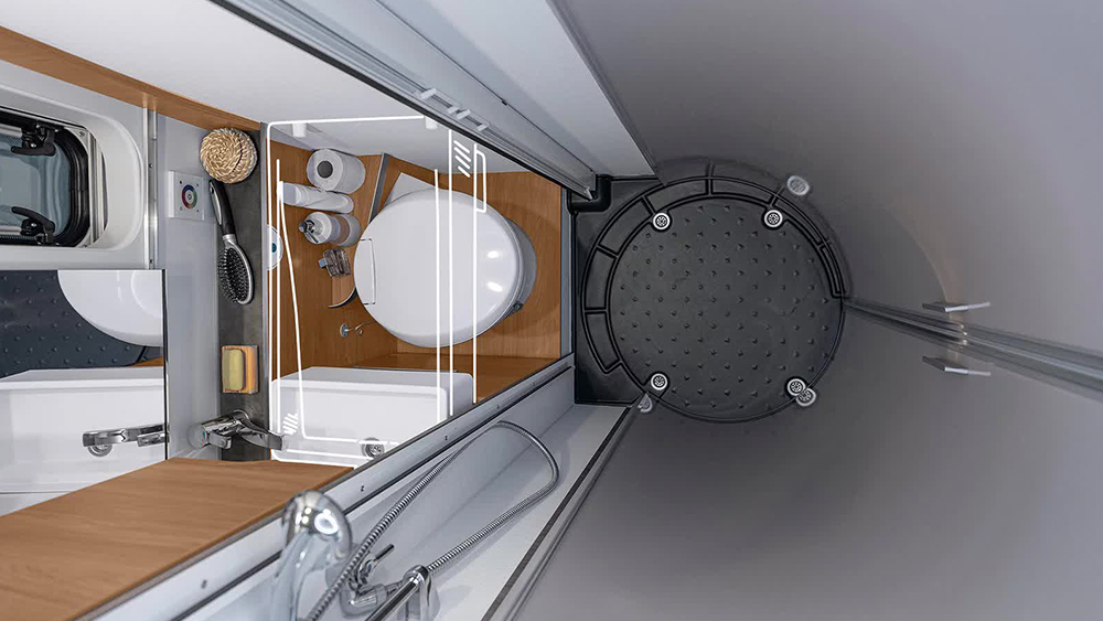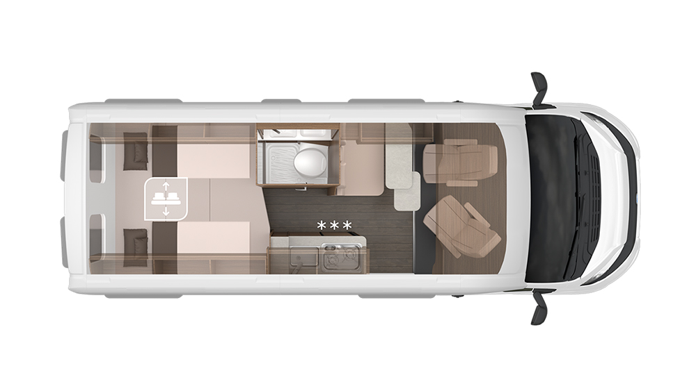 All'interno, l'ambiente è ben progettato per sfruttare al meglio ogni centimetro disponibile: l'altezza interna di 190 cm crea una sensazione di spaziosità. Il veicolo ha una massa del veicolo in ordine di marcia di circa 2.805 kg, con una capacità massima di carico di 3.300 kg, ideale per lunghe avventure senza compromessi.