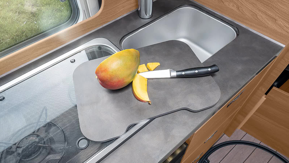 Il sistema di gestione delle risorse idriche è avanzato, con un serbatoio di recupero acque grigie da 90 litri e un serbatoio di acque chiare da 102 litri. La cucina è completamente attrezzata con fornello a 2 fuochi, frigorifero da 70 litri e un layout ergonomico che favorisce la preparazione dei pasti anche durante i viaggi più lunghi.