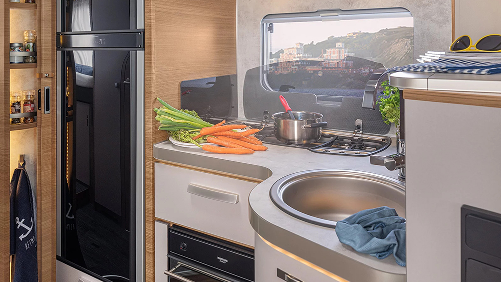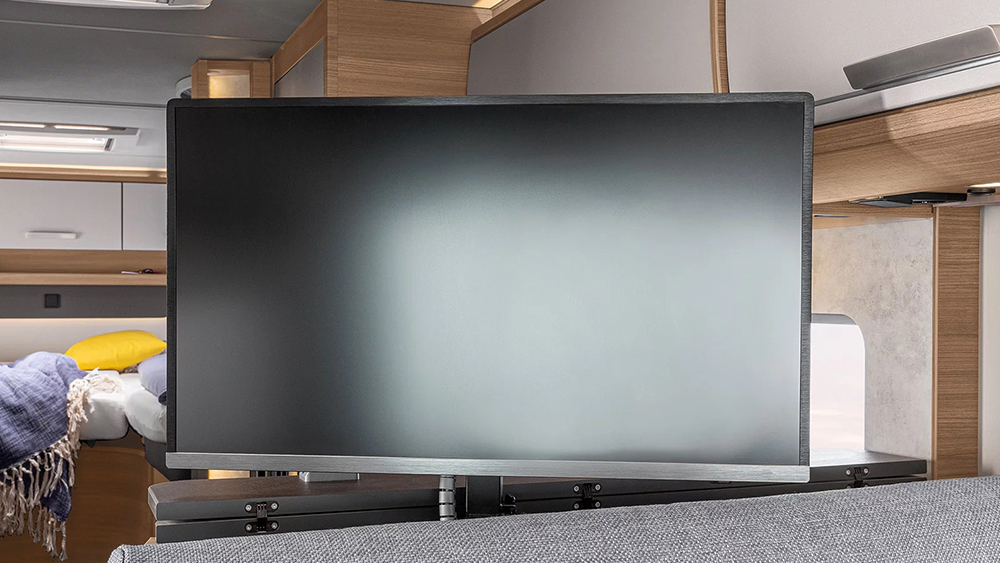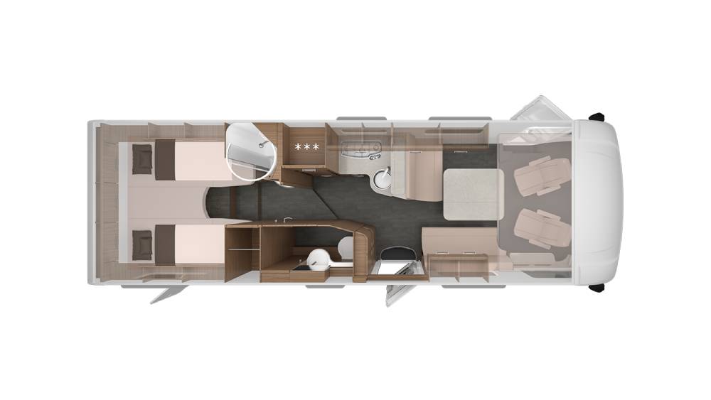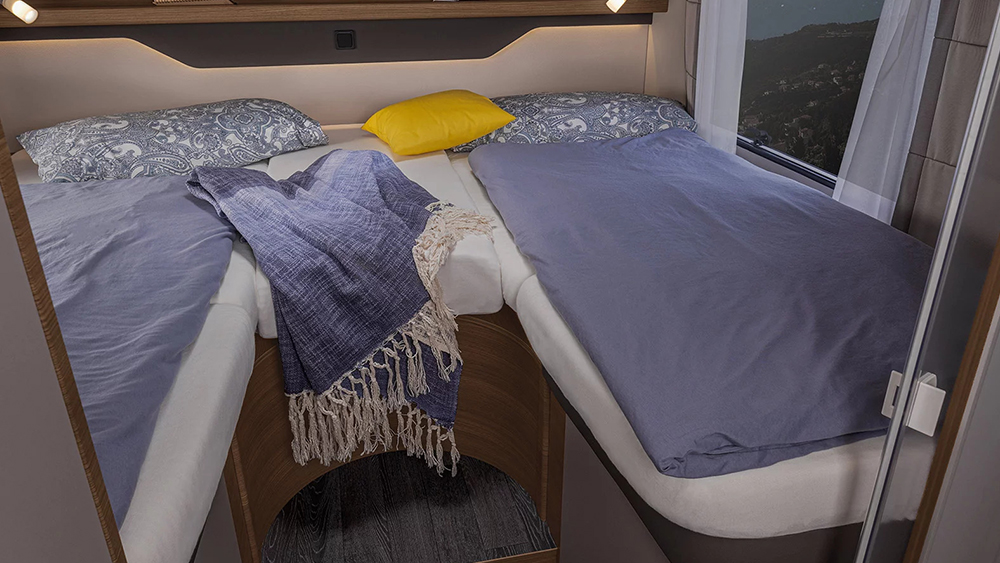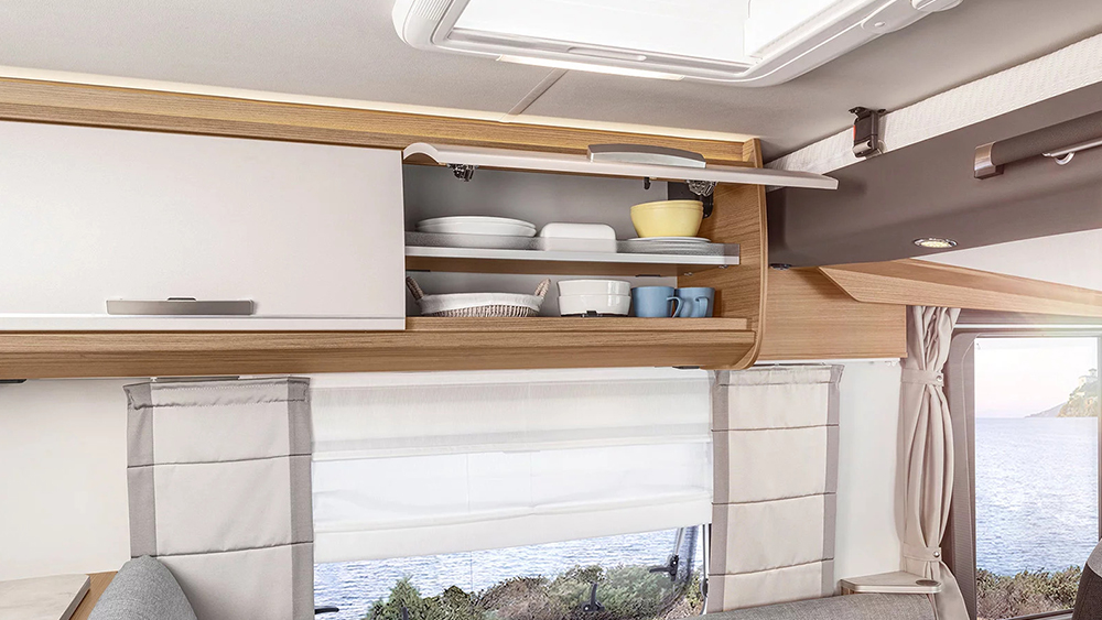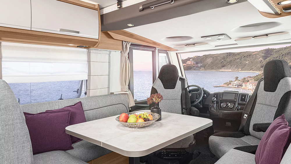 All'interno, il design del mobilio Matara Teak Tiberino e le superfici Samoa creano un ambiente raffinato, completato dai rivestimenti in vinile Natural Oak. Il soggiorno e la zona notte sono caratterizzati da una dinette ad L con tavolo telescopico, convertibile in un letto supplementare, e un letto basculante con accesso facilitato dalla cabina.