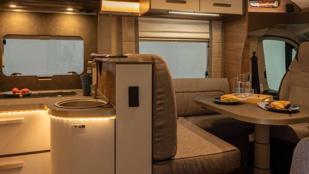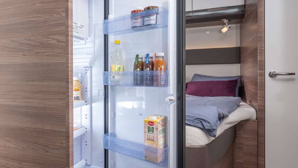 La zona abitativa è progettata con cura per offrire il massimo comfort e praticità. I letti basculanti e quelli nella parte anteriore e posteriore assicurano un riposo rigenerante durante il viaggio, mentre la cucina completamente attrezzata e il frigorifero da 133 litri consentono di preparare e conservare i pasti con facilità.