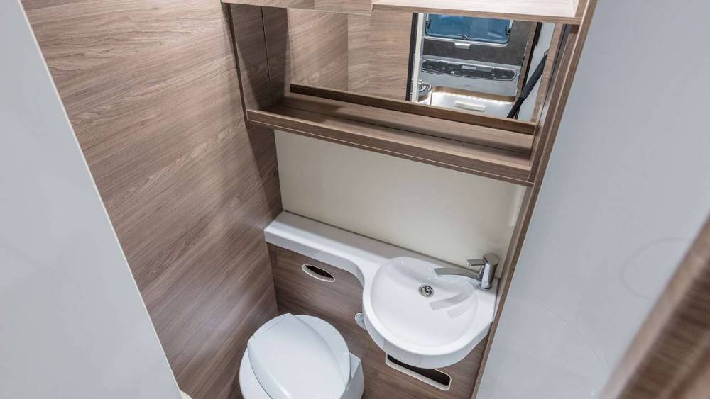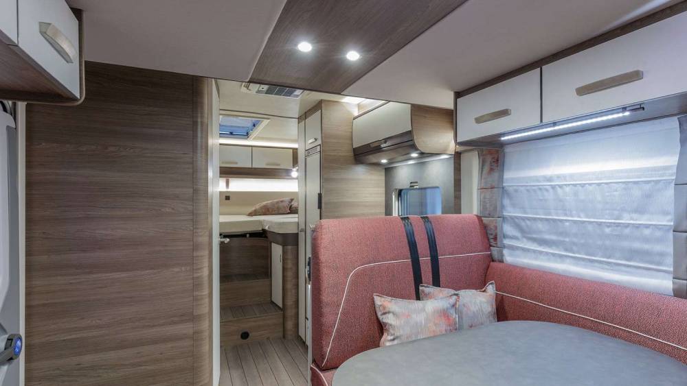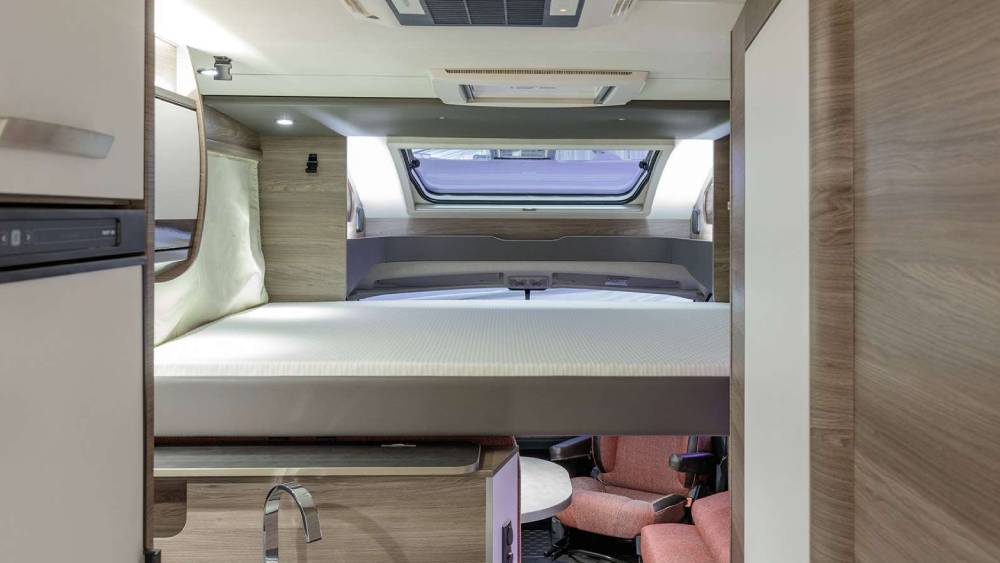 La cucina è attrezzata con un frigorifero da 142 litri con selezione automatica dell'energia, un fornello a 3 fuochi con ripiano di copertura in vetro e cassetti con funzione Soft-Close. Il bagno longitudinale include una doccia e un WC a cassetta girevole DOMETIC, garantendo comfort e praticità anche in viaggio.
