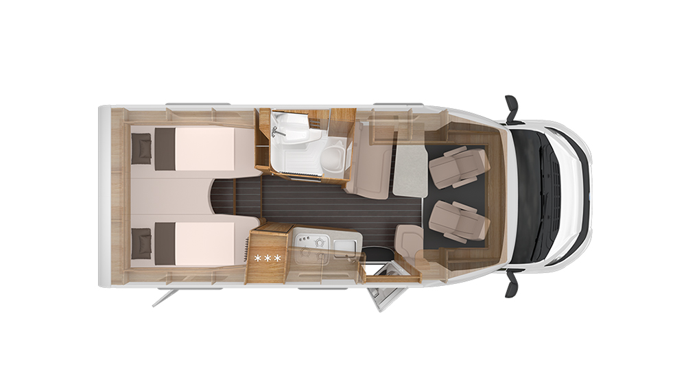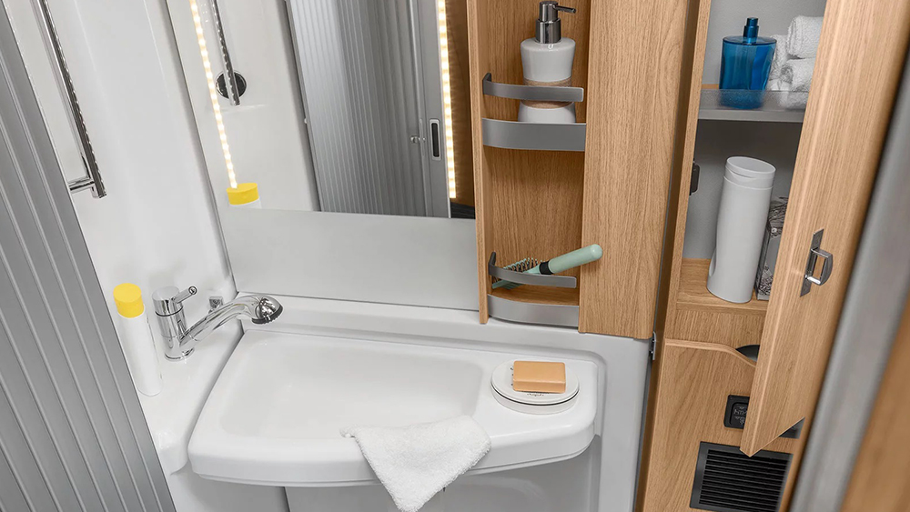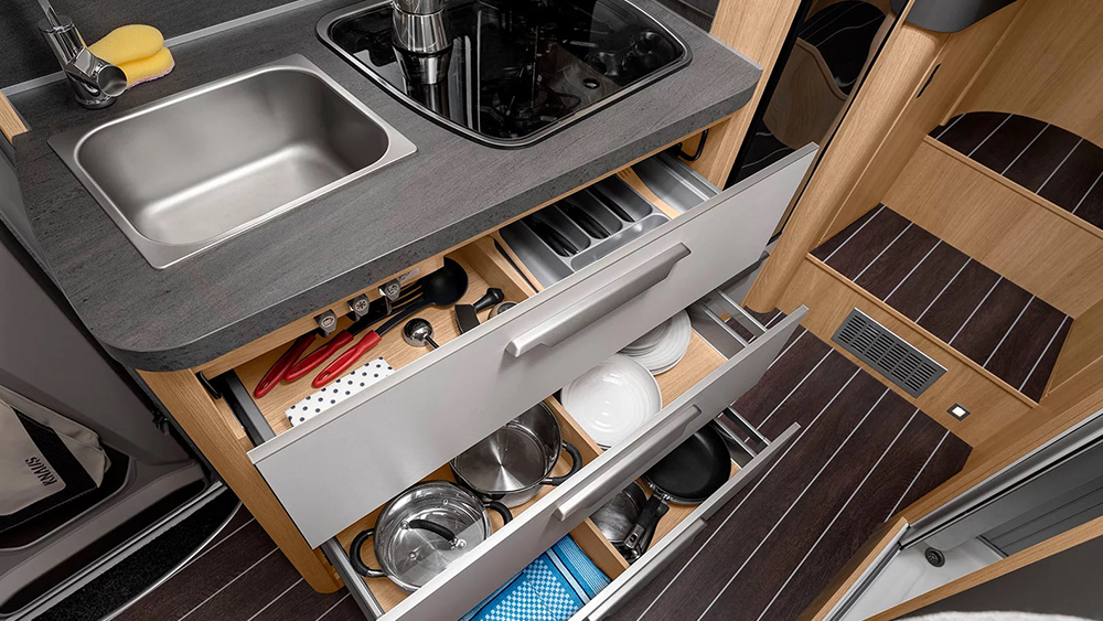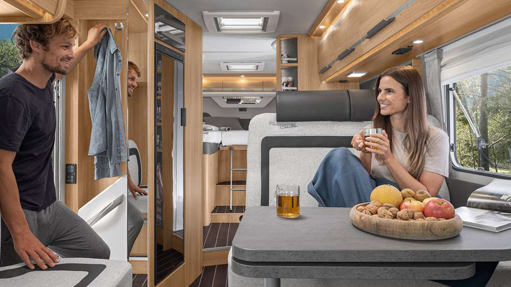 In cucina, un frigorifero da 142 litri e un serbatoio d'acqua da 100 litri offrono tutto il necessario per un viaggio autonomo. La qualità costruttiva si riflette nei dettagli come le serrature in metallo dei mobili e le ante con funzione Soft-Close, mentre l'illuminazione a LED e la luce veranda con sensore di movimento migliorano l'usabilità del veicolo in ogni situazione.