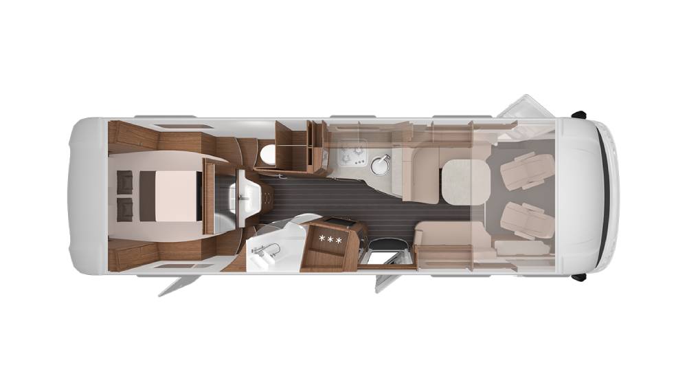 L'abitacolo accogliente include fino a 4 posti letto con un letto basculante di 200 x 150 cm e un letto posteriore di 200 x 153 cm, entrambi dotati di cinture di sicurezza a 3 punti. La cucina è completa di frigorifero da 177 litri e tutte le comodità necessarie per cucinare durante i viaggi. Il sistema elettrico è ricco di dotazioni, inclusi numerosi punti di prese 230 V e USB distribuiti strategicamente.