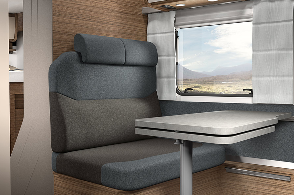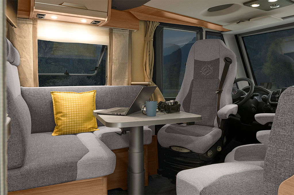 Il parabrezza panoramico regala agli occupanti una vista mozzafiato del paesaggio circostante, integrando perfettamente l'esperienza di viaggio con la bellezza naturale. Gli eleganti sedili Aguti di alta qualità garantiscono comfort e supporto durante i lunghi viaggi, mentre il bagno a volume variabile offre flessibilità e praticità senza compromessi.