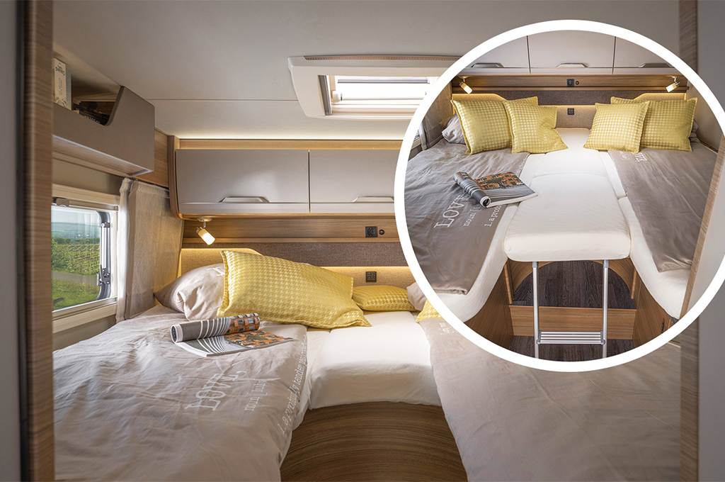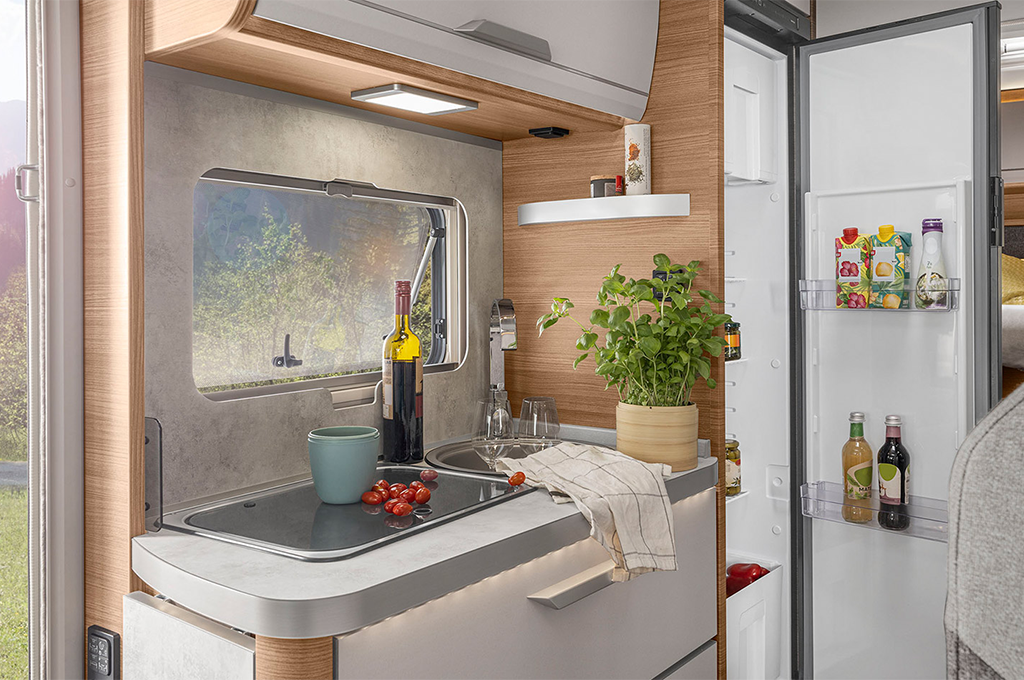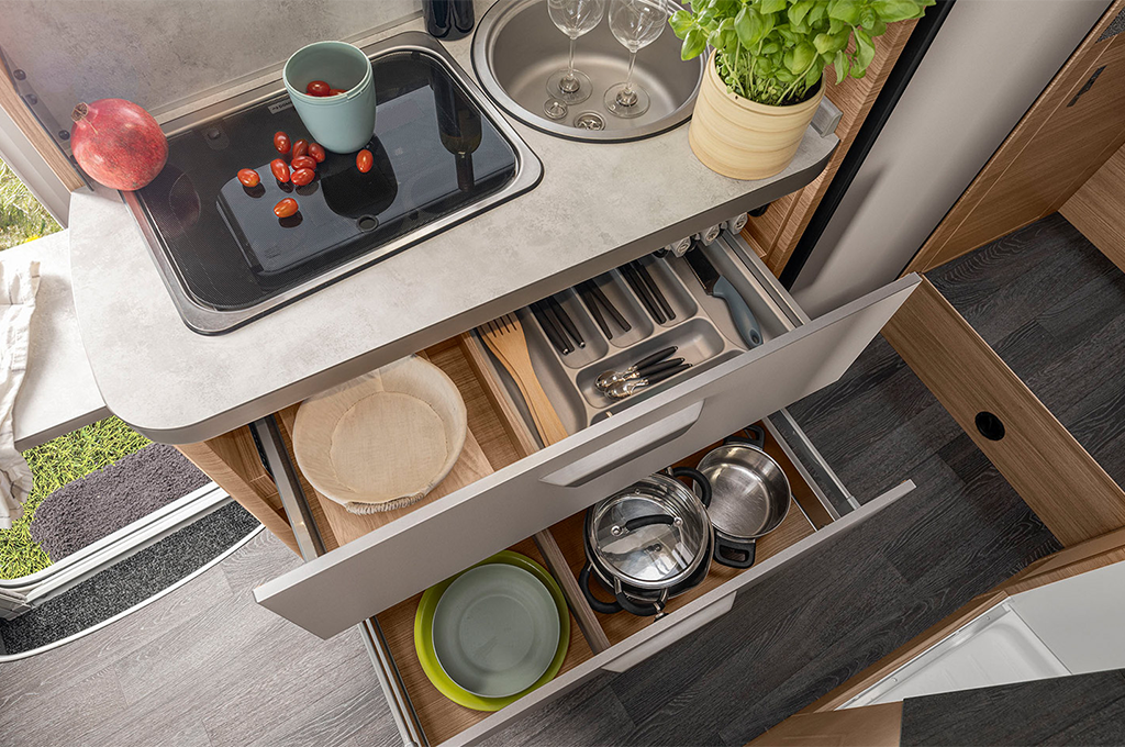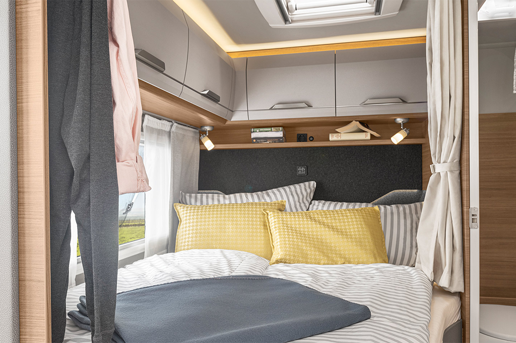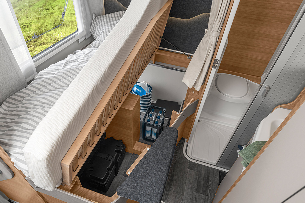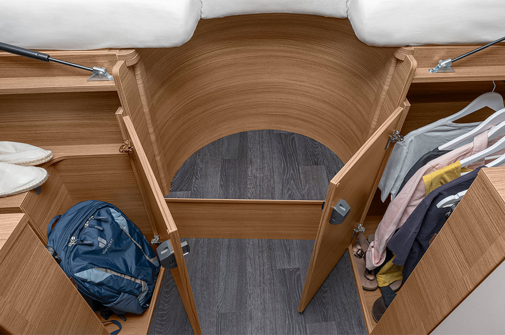 Uno dei punti di forza del Van I è la sua abilità nel massimizzare lo spazio interno senza sacrificare l'accessibilità. La realizzazione esclusiva del letto basculante consente di sfruttare al massimo l'altezza abitativa, regalando una sensazione di spazio sorprendentemente ampia e confortevole. Inoltre, le ante dei mobili pensili con meccanismo di chiusura Soft-Close aggiungono un tocco di lusso e raffinatezza, assicurando che ogni dettaglio sia curato con precisione.