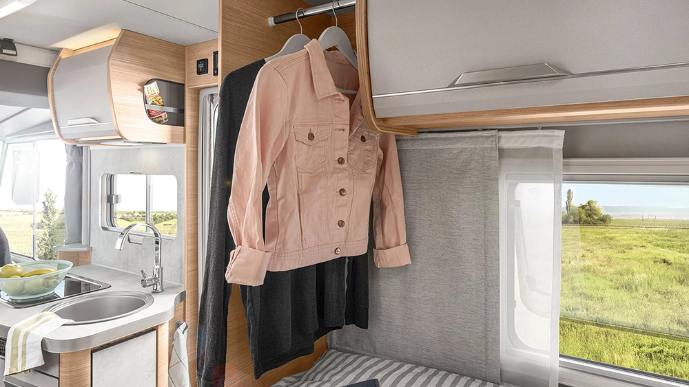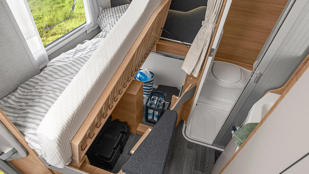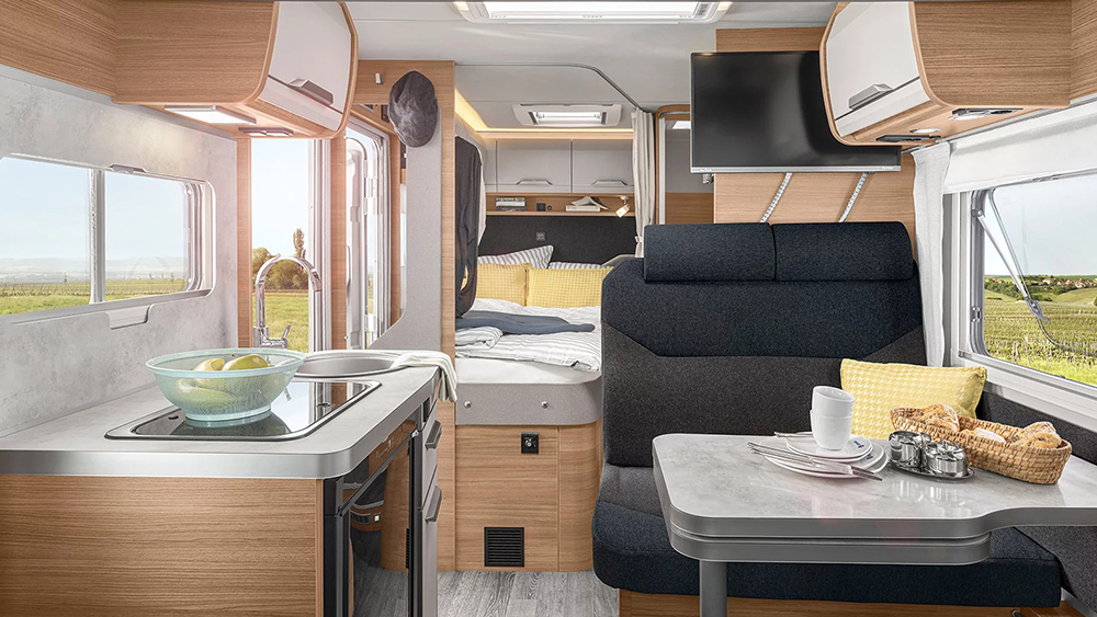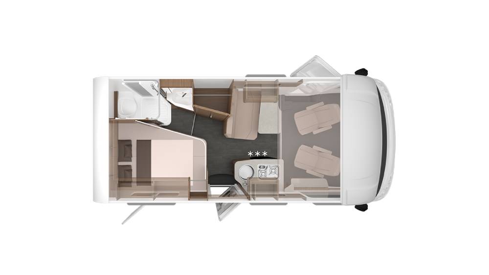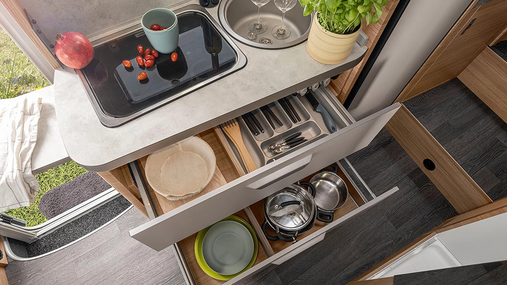 La dotazione di base include una cucina completamente attrezzata con frigorifero da 98 litri, ideale per preparare pasti deliziosi durante il viaggio. Il comfort è garantito anche dall'aria condizionata in cabina, dai sedili regolabili e dai numerosi dispositivi di assistenza alla guida, come il Tempomat - Cruise Control, ESP e Hill Holder.