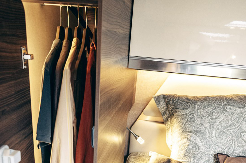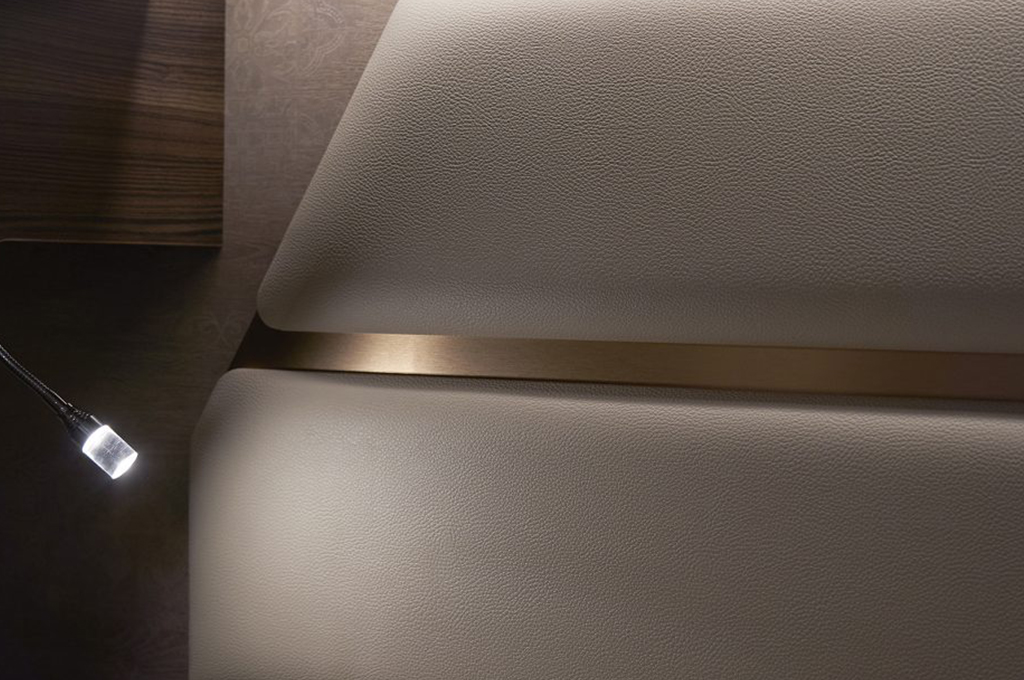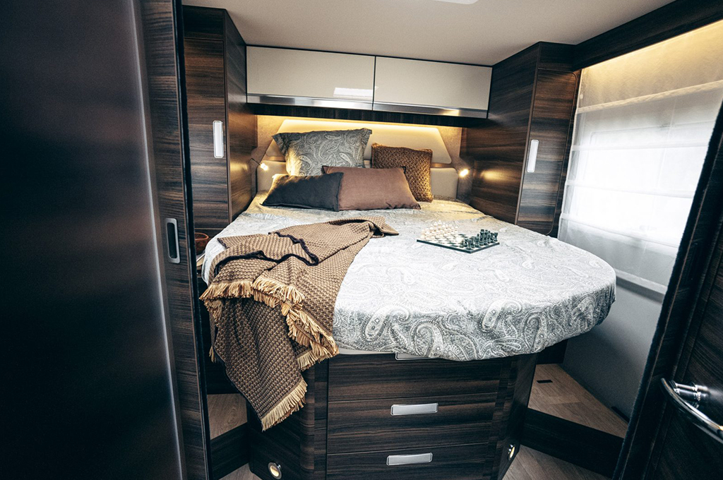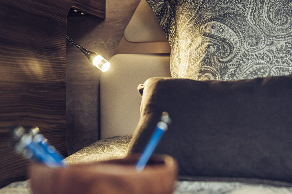 - Letto basculante completamente integrato nella linea dei pensili, completo di rete a doghe, materasso di alta qualità, tenda perimetrale di cortesia, luci di lettura orientabili, prese USB, oblò a tetto, vano di stivaggio dedicato, riscaldamento, tenda di separazione, e impianto di illuminazione plurivie