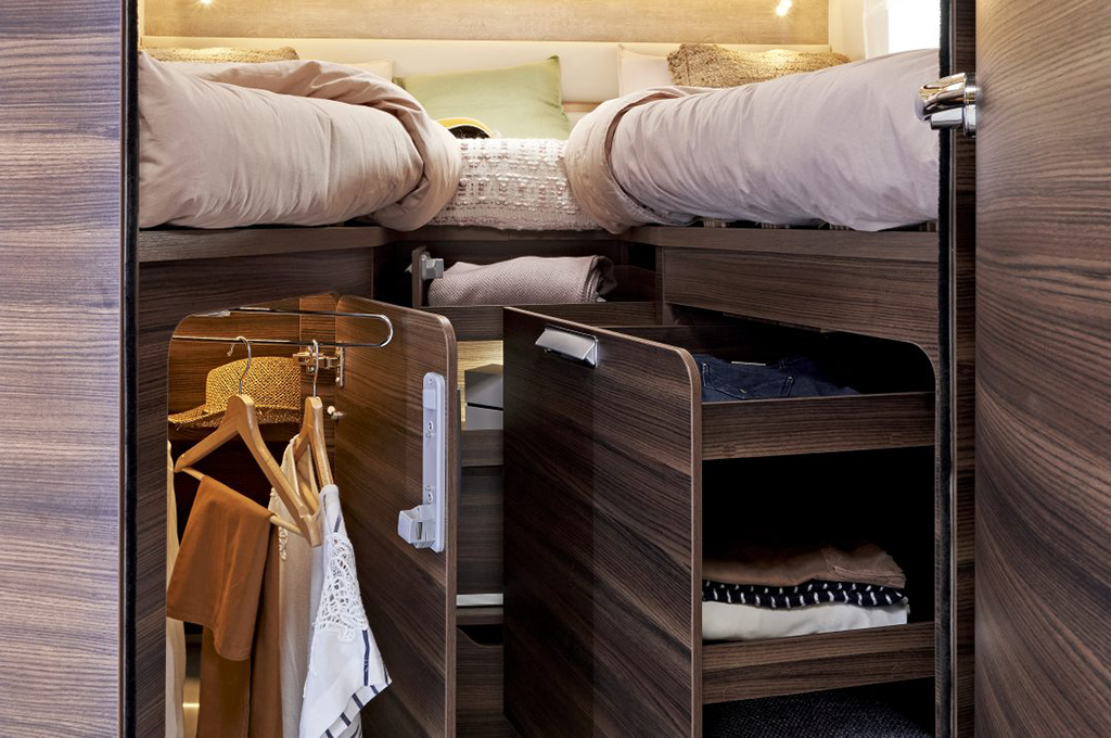 - Cassapanche a volume variabile con possibilità di unire la volumetria di stivaggio con quella del sottostante doppio pavimento e ospitare così oggetti particolarmente sviluppati in altezza