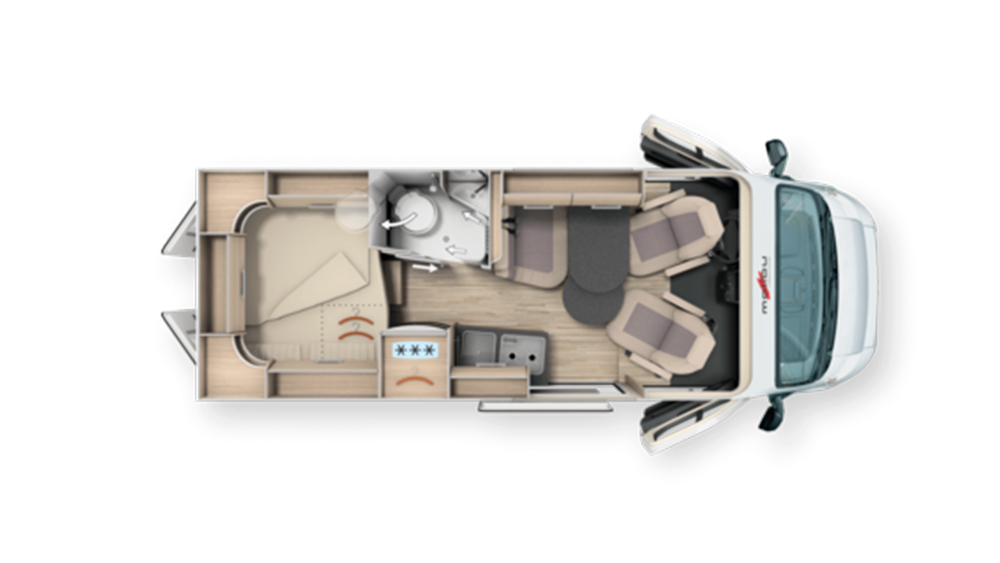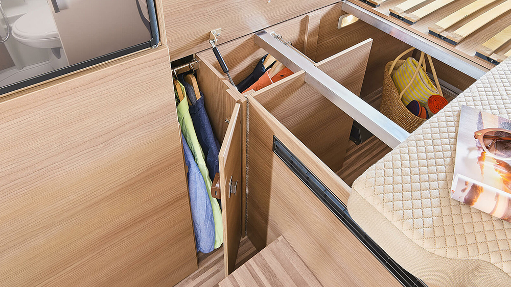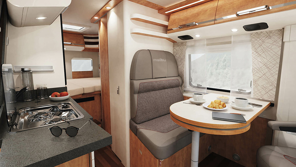 Inoltre, l'accesso rapido a svariati vani di stivaggio e la porta scorrevole sezionata in due parti rendono la vita a bordo del Malibu Comfort estremamente pratica e funzionale, garantendo libertà di movimento e facilità d'uso in ogni situazione. Con la gamma Malibu Comfort, il comfort è davvero re di ogni viaggio.