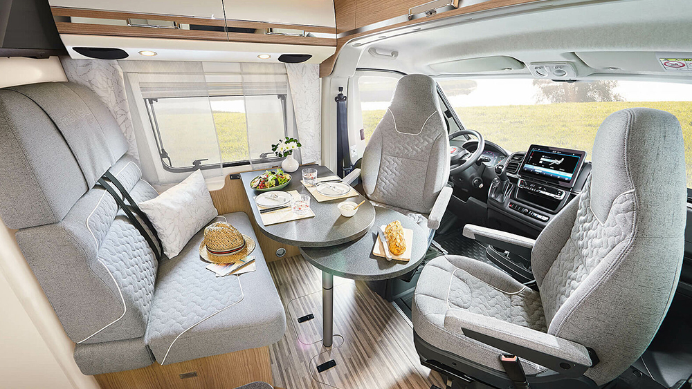 Nella zona giorno, il grande gruppo sedute "Maxi 4" accoglie fino a quattro persone con un design ergonomico che integra perfettamente i sedili girevoli della cabina di guida. Gli armadi pensili sopra la cabina e i ripiani di design aggiungono ulteriore spazio di stivaggio, mentre lo schermo piatto smart LED optional offre intrattenimento a bordo.