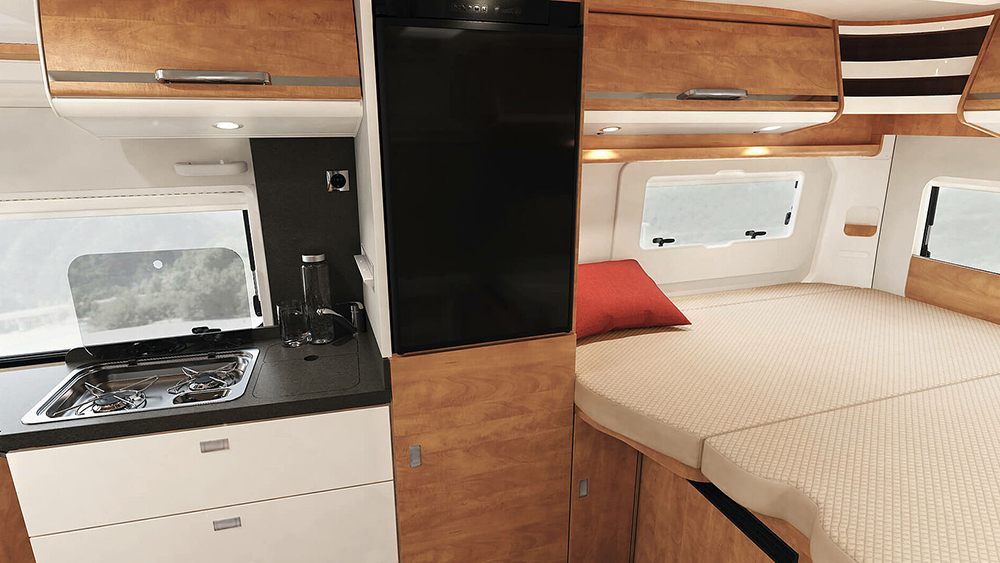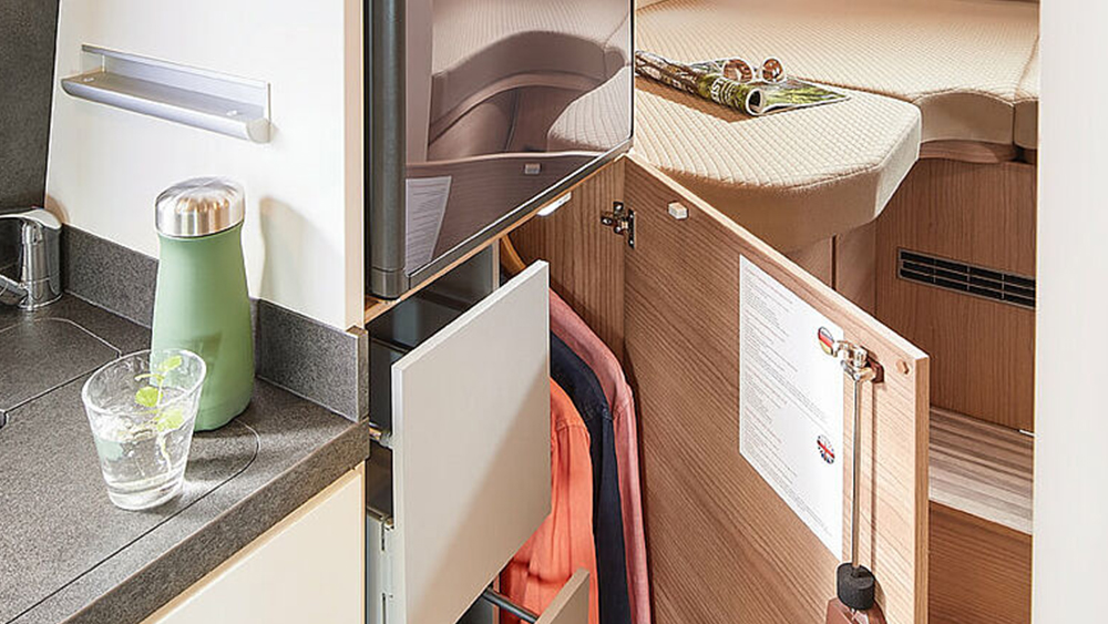 In cucina, il massimo comfort è garantito da un frigorifero posizionato a un'altezza comoda, consentendo un accesso facile e rapido ai tuoi alimenti preferiti. Il piano di lavoro extra grande del Malibu Comfort 600 DB, insieme a cassetti della cucina extra larghi, offre ampio spazio per preparare i pasti più deliziosi anche durante i viaggi più lunghi.