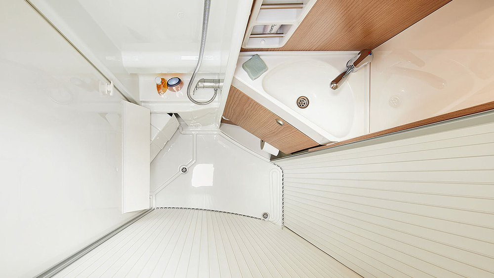 Nel bagno flessibile XL "1000", ogni dettaglio è stato curato per offrire comfort e funzionalità. La toilette a scomparsa ottimizza lo spazio, mentre il vano doccia completamente separabile assicura una pulizia comoda e priva di fastidi. Con ampio spazio verticale per la testa sopra il lavello e un pratico ripiano a parete, il bagno diventa un'oasi di comfort anche durante i viaggi più avventurosi.