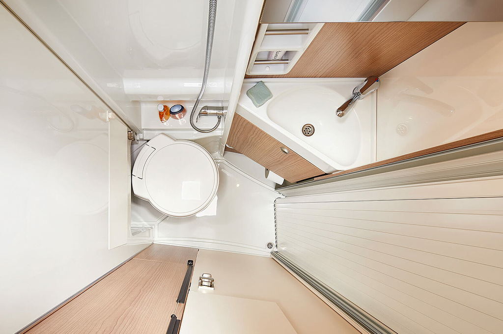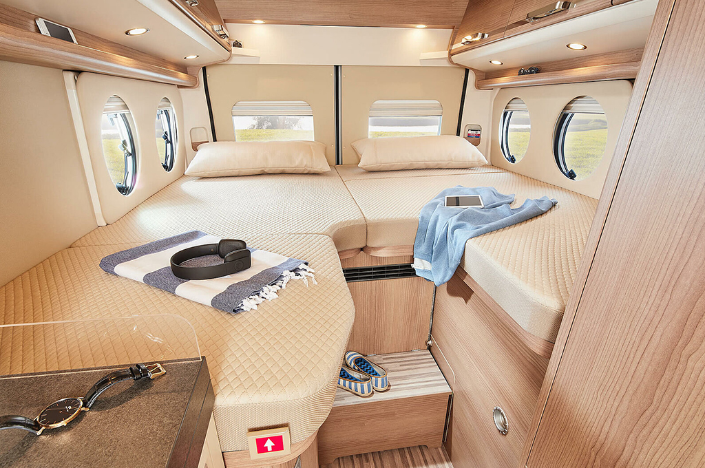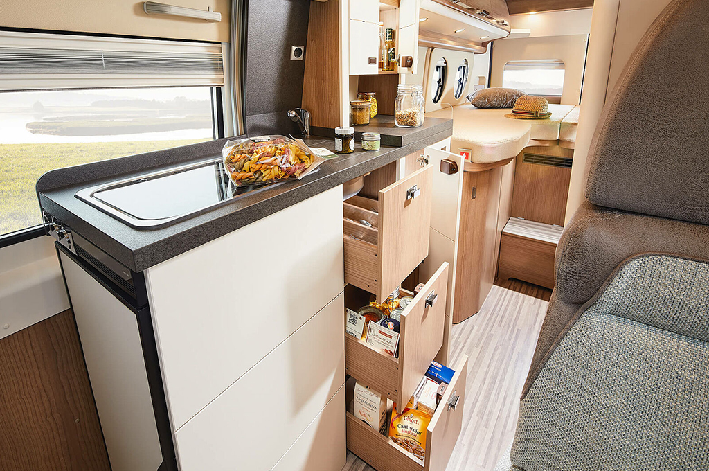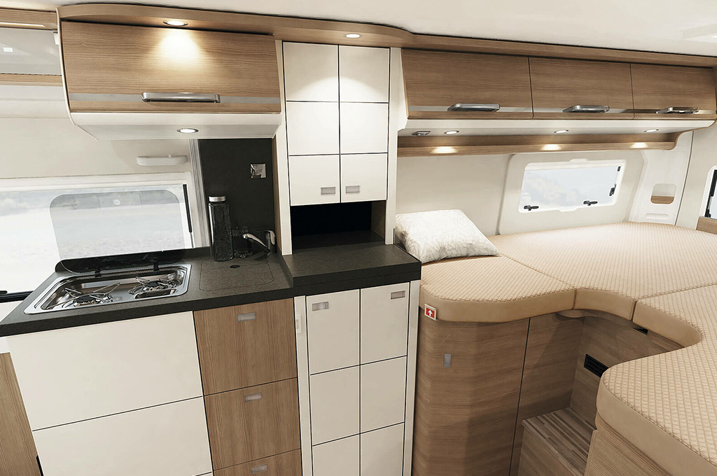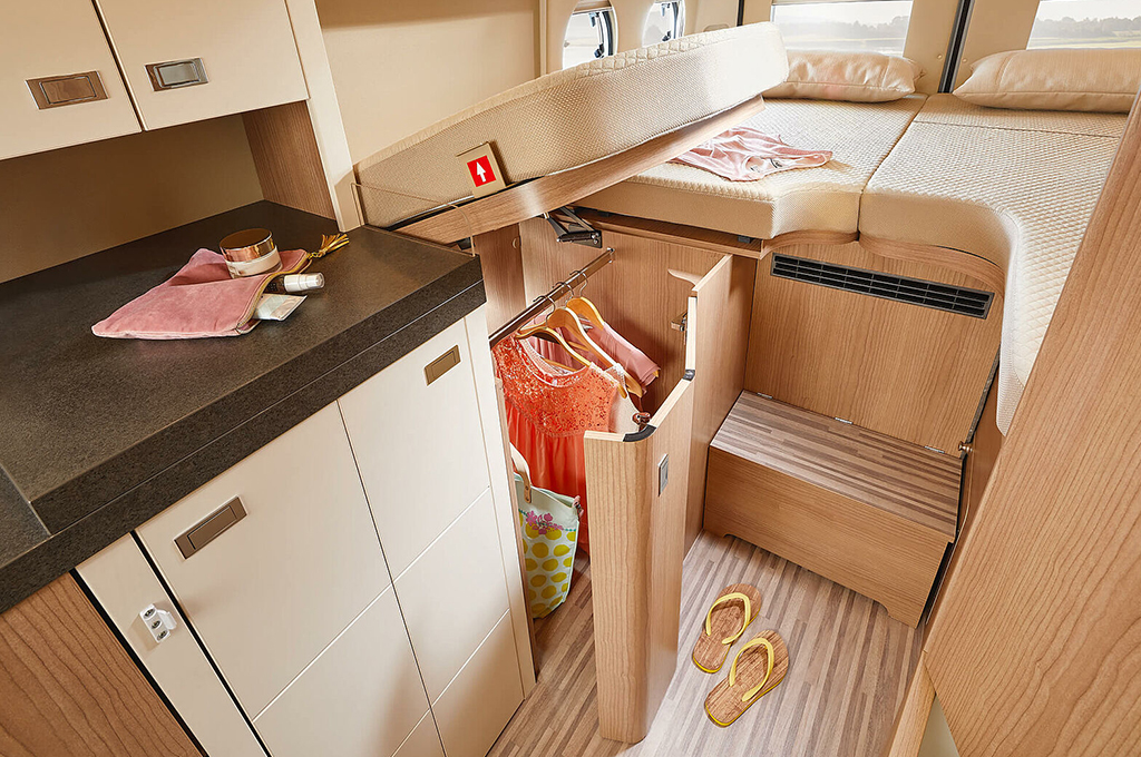 La cucina premium offre un ampio piano di lavoro, cassetti profondi con chiusura Softclose e un frigorifero a compressore integrato per un facile accesso. Il bagno flessibile XL "1000+ funzione spogliatoio" include una toilette a scomparsa e uno spazio doccia separabile, con ampio spazio verticale e pratici vani per gli accessori da bagno.