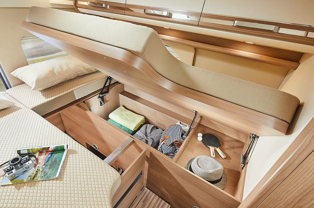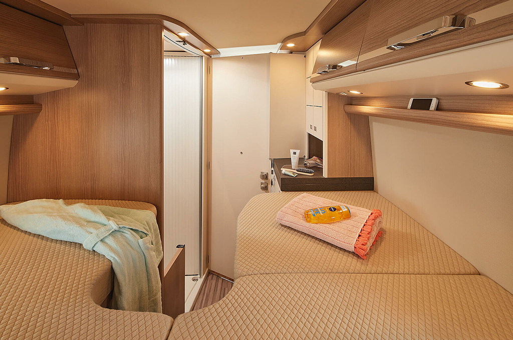 Nella zona notte, il letto singolo longitudinale "200+" assicura comfort con doghe aerate e materassi in schiuma fredda, mentre gli armadi guardaroba offrono soluzioni di stivaggio versatile. Opzioni come il charming GT skyview e il charming coupé aggiungono varietà, rispondendo alle diverse esigenze di spazio e design.