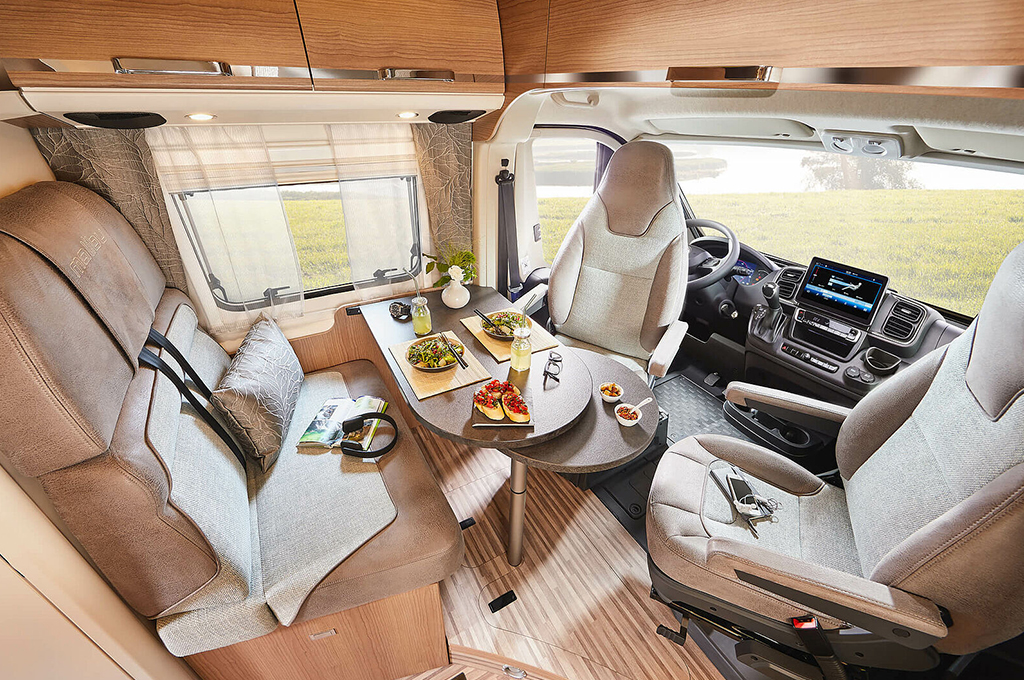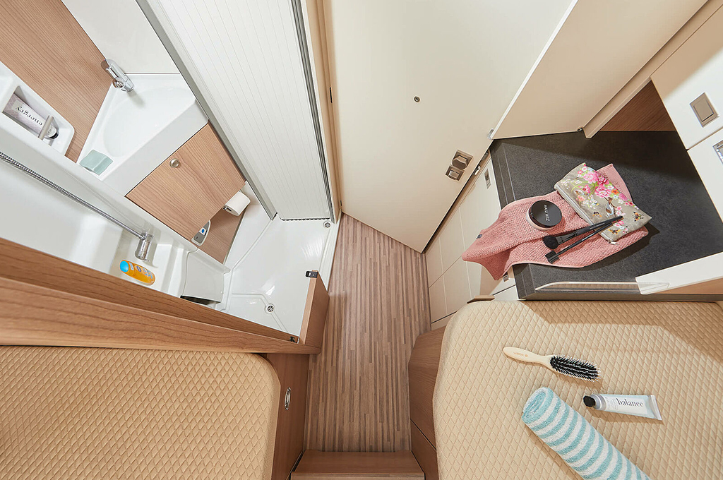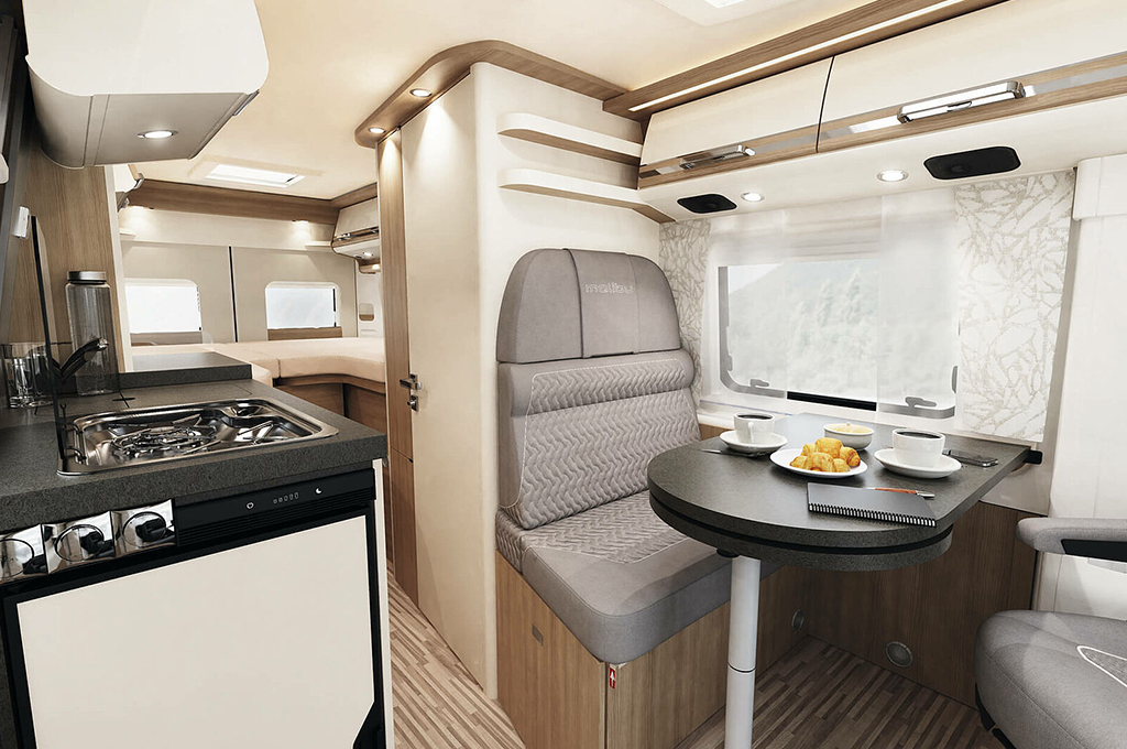 Nella zona giorno, il gruppo sedute "Maxi 4" accoglie comodamente quattro persone, integrando perfettamente sedili girevoli e un tavolo con prolunga ruotabile. Armadi pensili sopra la cabina e ripiani di design offrono ampio spazio di stivaggio, arricchito dall'opzione di un TV smart LED da 24". L'elegante area di ingresso è impreziosita dal branding Malibu cromato e dall'illuminazione d'ambiente indiretta, mentre una nuova geometria di apertura del gruppo sedute massimizza l'ampiezza del corridoio verso la cucina.