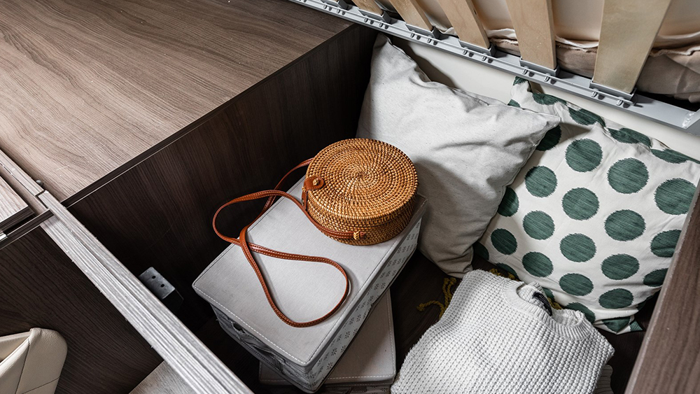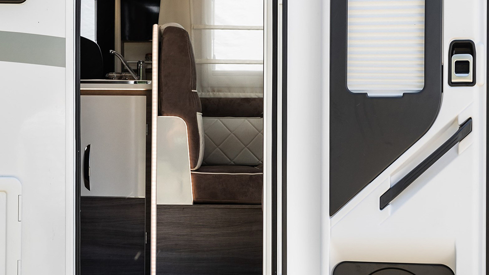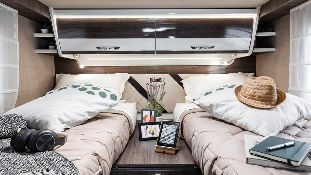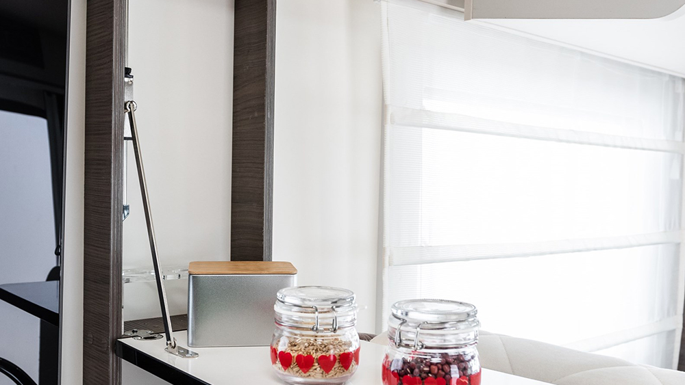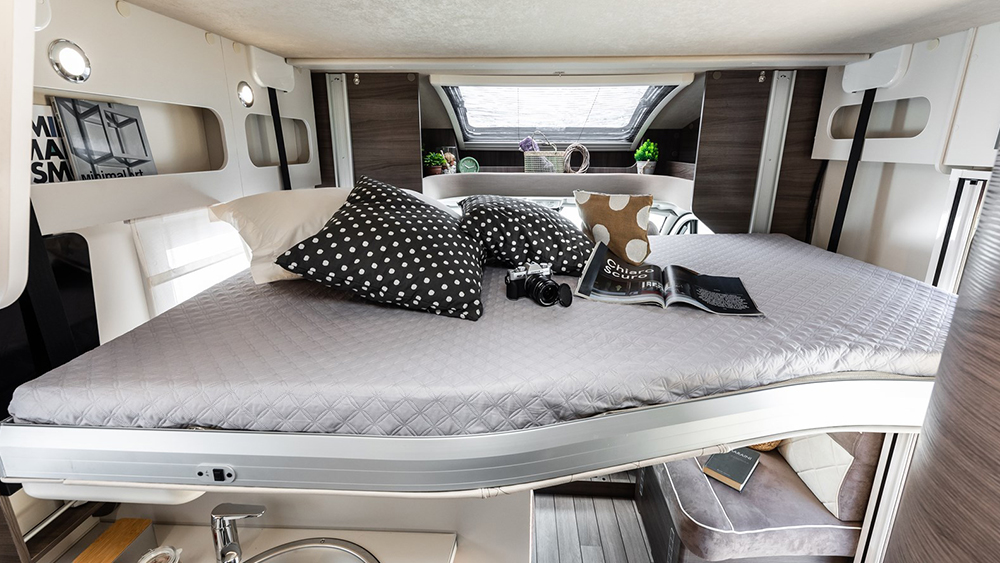 All'interno, la dotazione comprende una radio DAB Bluetooth con comandi al volante, oblò con ventola per una corretta aerazione e doghe nei letti per un riposo confortevole. La separazione interna giorno/notte assicura privacy e comfort durante tutto il soggiorno.