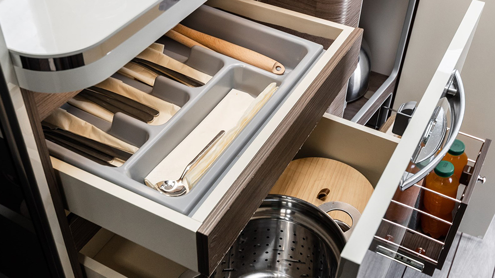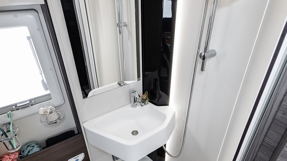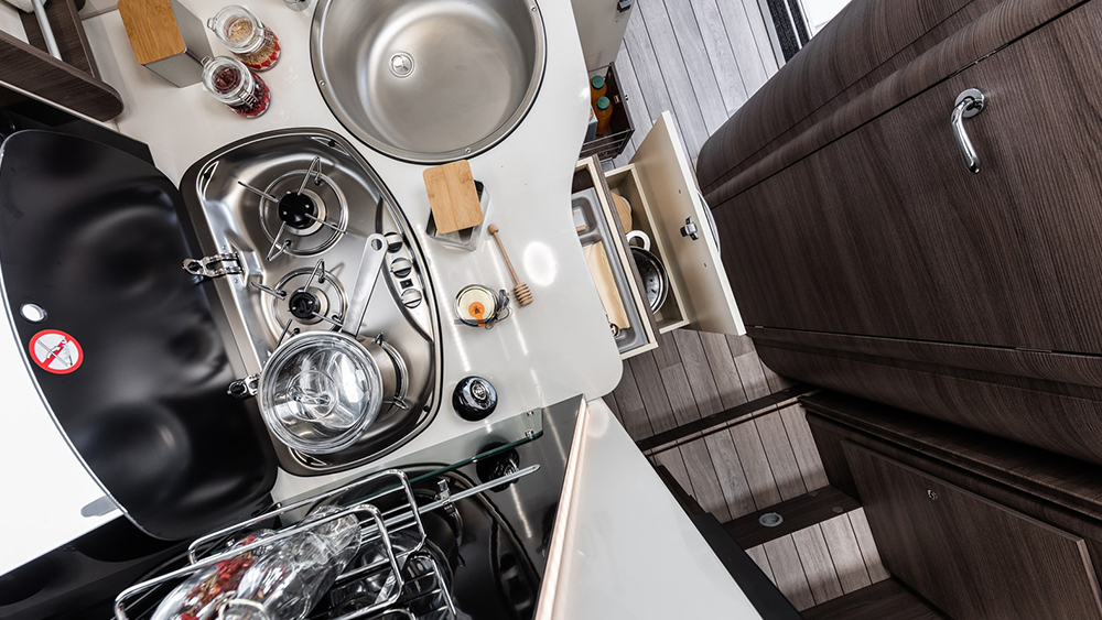 Gli impianti sono completi e funzionali, con spazio per due bombole di gas e capacità massime dei serbatoi per acqua chiara e grigie. Il frigorifero trivalente automatico assicura la conservazione ottimale degli alimenti in ogni situazione.