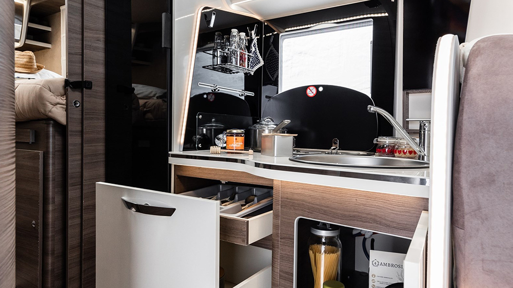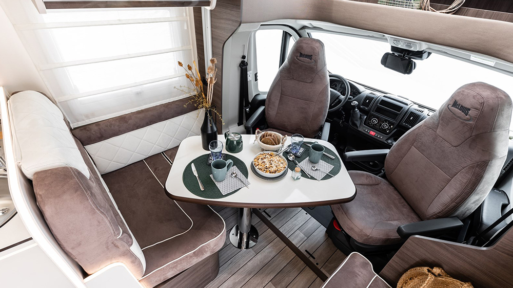All'interno, l'attenzione al comfort è evidente con sedili girevoli per guidatore e passeggero, e un sistema di climatizzazione manuale per la cabina. I posti letto sono ben distribuiti, con un quinto posto omologato e letti supplementari sia nella dinette trasformabile che nella zona posteriore.